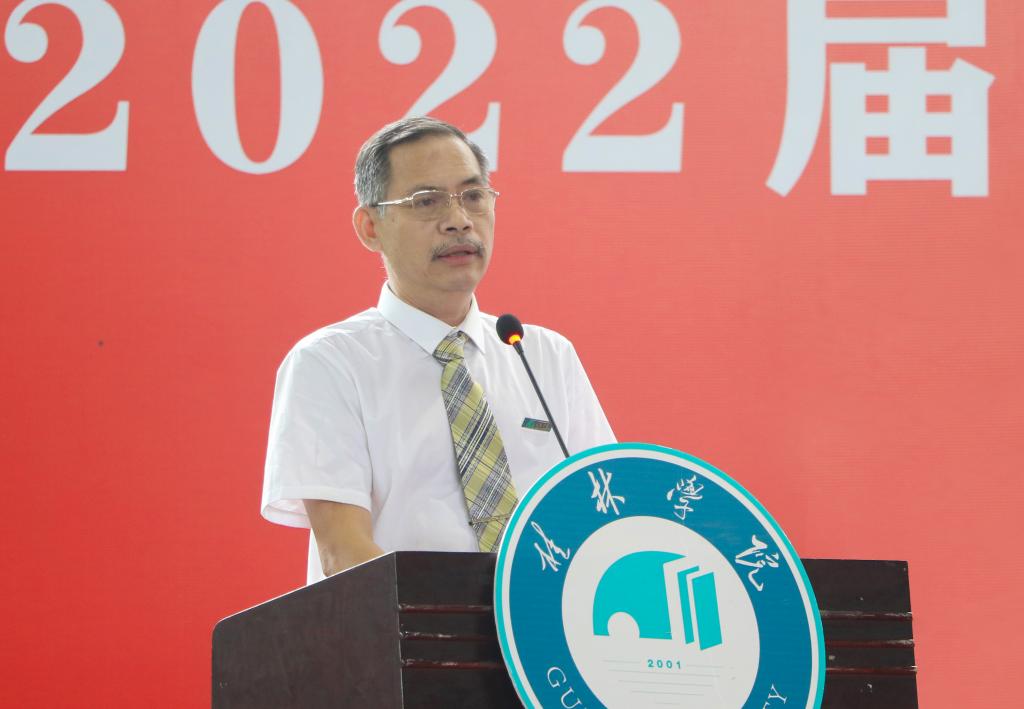 在铿锵有力的国歌声中,2022届学生毕业典礼拉开序幕。校长、校学位评定委员会主席杨树喆发表了热情洋溢的讲话。他首先代表学校向全体毕业生表示热烈的祝贺,向为同学们成长成才付出辛劳的老师和家长们致以崇高的敬意。接着,他饱含深情地带领同学们回顾了过去四年中令人难忘的三件大事:中华人民共和国成立70周年、中国共产党建党100周年的欢庆,抗击新冠疫情的艰难岁月,广西师范大学漓江学院转设为桂林学院,展望了桂林学院“十四五”时期的发展蓝图,并承诺所有在广西师范大学漓江学院学习的学生都是桂林学院的校友。临别之际,杨树喆对全体毕业生给予三点希望:一是希望同学们心系祖国,志存高远,牢记领袖教诲,立志民族复兴,争做堪当民族复兴重任的时代新人;二是希望同学们直面挫折,自信乐观,保持阳光心态,永远保持“孤身走暗巷、不跪的模样、对峙过绝望”的孤勇者姿态;三是希望同学们终身学习,永葆奋斗激情,永葆求知热情,树立终身学习的理念,使学习和阅读成为一种生活习惯,保持内心世界的安宁与强大,让自己有持续的增量成长。