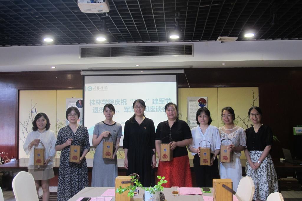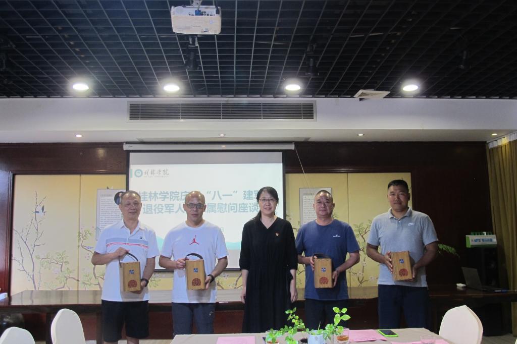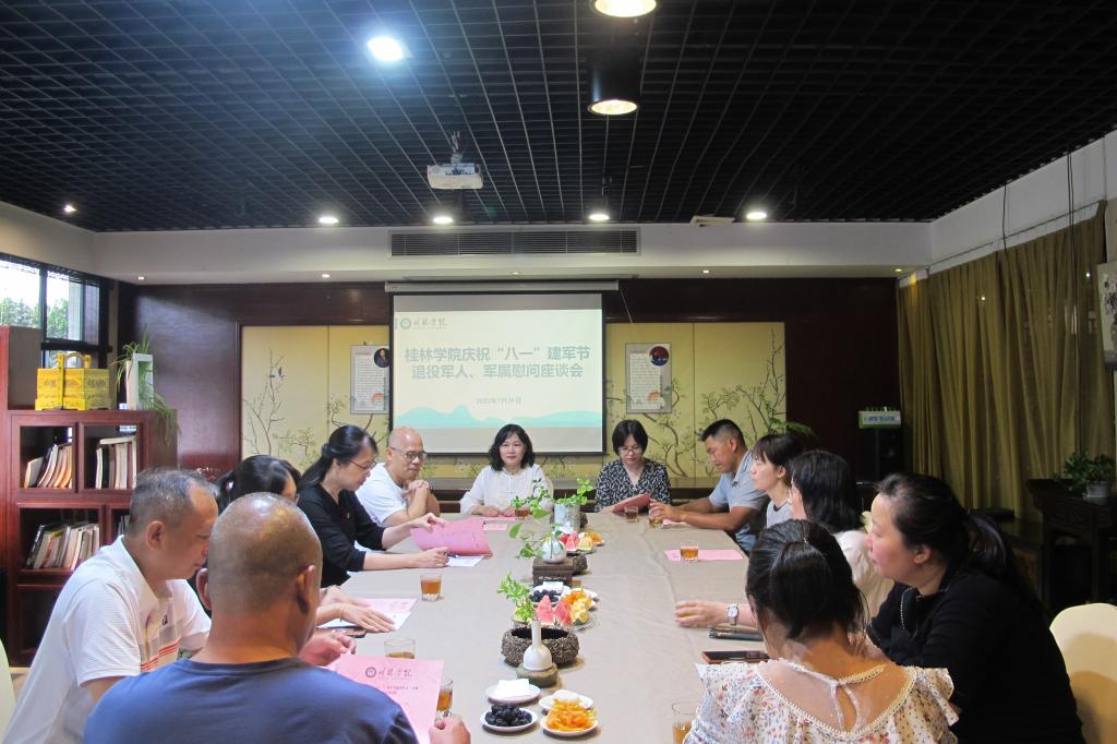 中国人民解放军建军95周年即将到来之际,为庆祝“八一”建军节,共叙军民鱼水情,7月29日上午,学校在桂林半壁江山茶•会馆举办“我与书记面对面”暨庆祝“八一”建军节退役军人、军属慰问座谈会,向退役军人及军属送上学校的亲切关怀和节日问候,感谢他们为国家军队建设做出的贡献。学校党组织负责人唐文红出席座谈会,退役军人、军属代表10人参加。座谈会由校工会常务副主席廖莎主持。