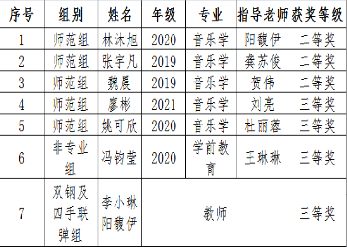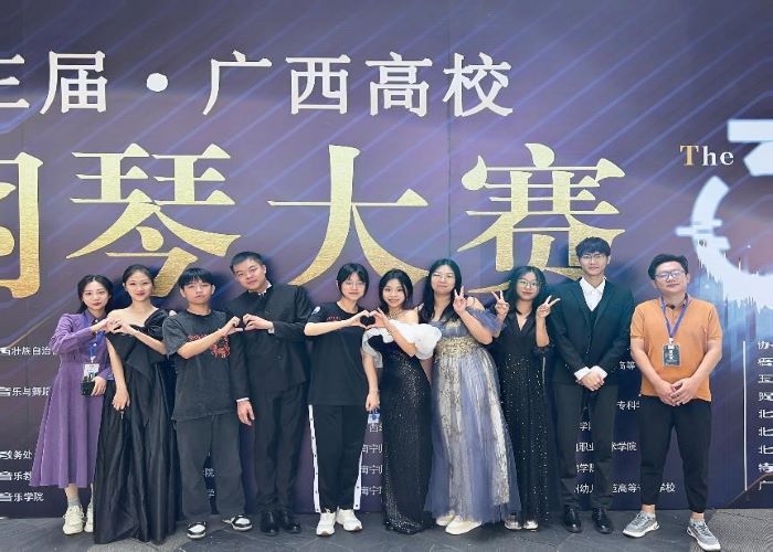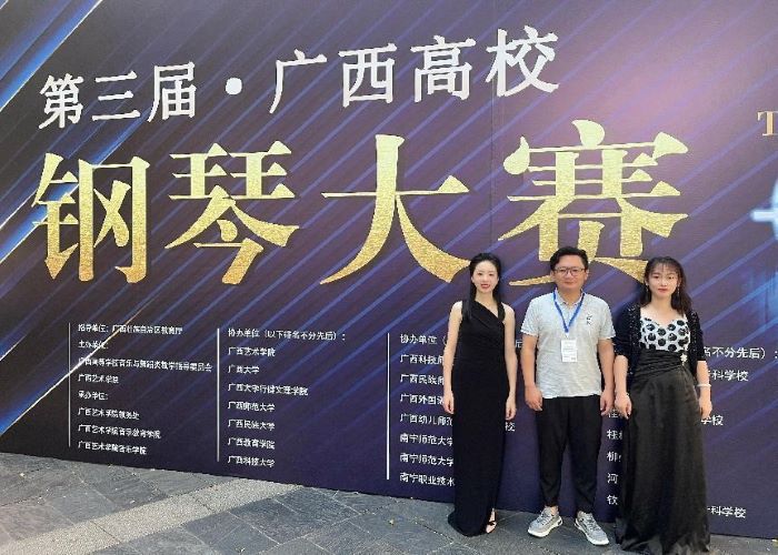 10月29-30日,由自治区教育厅主办,广西艺术学院承办的第三届广西高校钢琴大赛在南宁举行。我校选派12名学生、2名教师参加师范组、非专业组、双钢与四手联弹组的比赛。本赛事是广西区唯一一个由教育厅主办的专业钢琴比赛,代表了广西高校钢琴专业的最高水平。比赛历经两天角逐,我校教育与音乐学院8名师生在参赛者中脱颖而出,获师范组二等奖3项、三等奖2项,非专业组三等奖1项,双钢与四手联弹组三等奖1项。