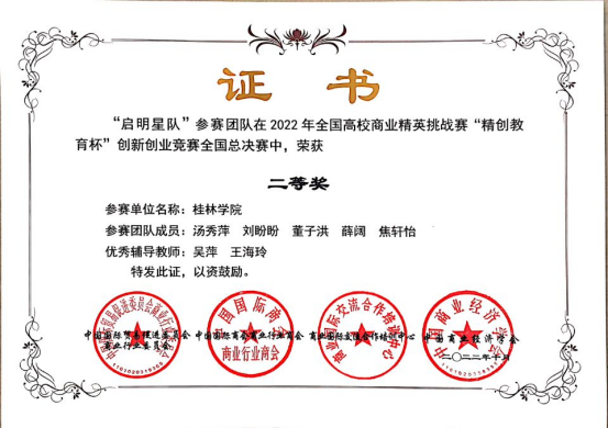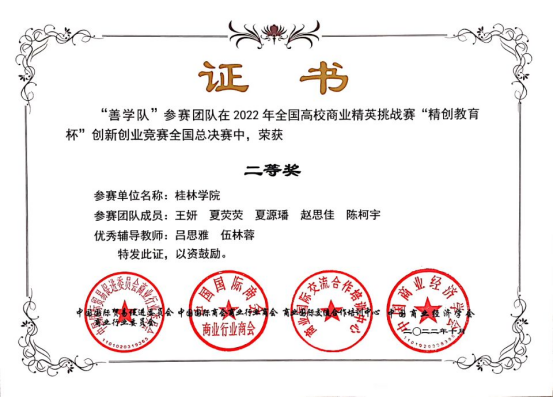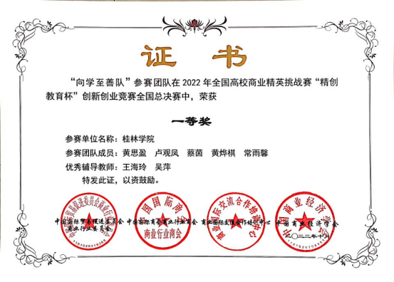 近日,2022年全国高校商业精英挑战赛“精创教育杯”创新创业竞赛全国总决赛在线落下帷幕。此次竞赛由中国贸促会商业行业委员会、中国国际商会商业国际商会、商业国际交流合作培训中心、中国商业经济学会主办,位于中国高等教育学会发布的“全国普通高校大学生竞赛榜单”56项学科竞赛的第52项,是颇具影响力的全国性品牌赛事。本次全国高校商业精英挑战赛“精创教育杯”创新创业竞赛全过程共有来自全国30个省、直辖市、自治区的300多所院校参加,晋级全国总决赛团队合计1417支,万余名师生共同参与。我校三支参赛队荣获全国总决赛一等奖1项、二等奖2项。