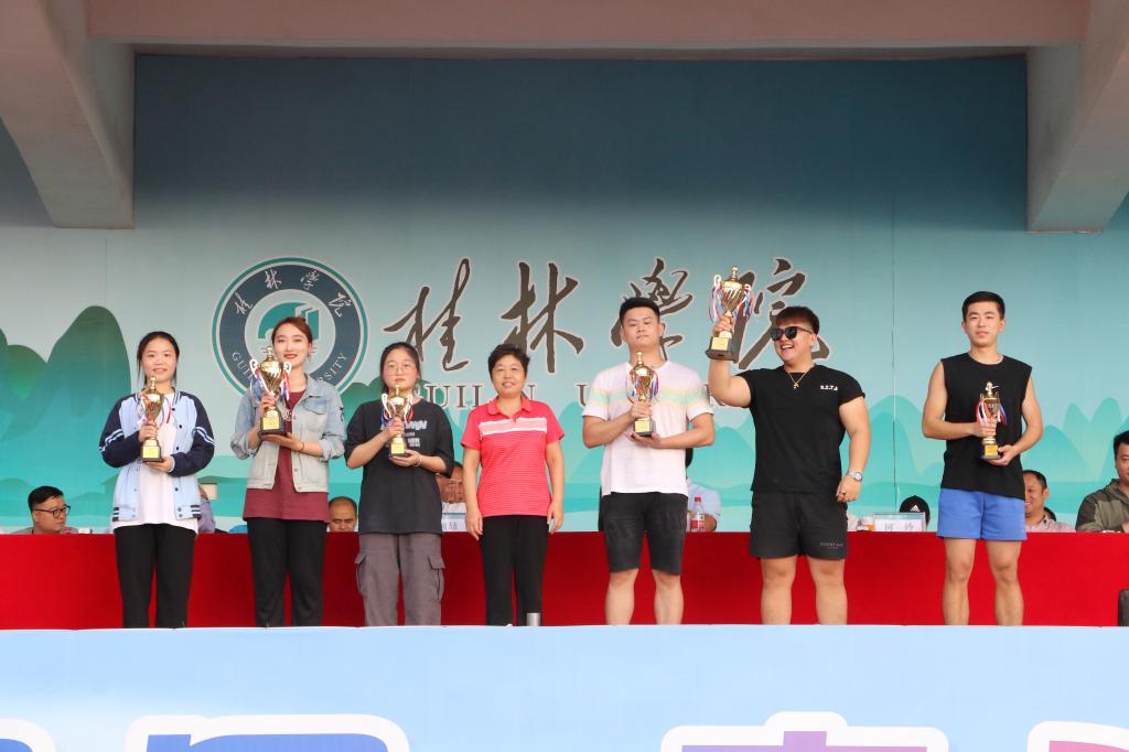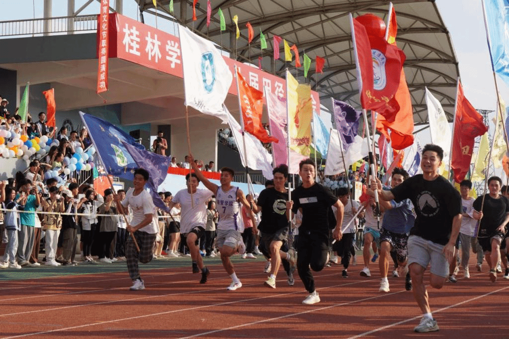 闭幕式开始前,学生男女组拔河比赛决赛在田径场激烈角逐,成为全场焦点。伴随着热烈的加油呐喊声,同学们在赛场上尽情挥洒汗水,展现出桂院学子团结协助、奋勇拼搏的精神风貌。最终传媒学院二队以微弱优势战胜传媒学院一队获得女子组第一名;传媒学院一队力战理工学院二队,夺取男子组桂冠。接着,各学院及班级、学生组织、学生社团开展了旗帜环跑活动,同学们通过接力环跑方式高举旗帜奋力奔跑,上演了桂院版“速度与激情”,将活动气氛推向高潮。