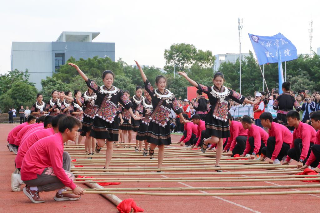 在激昂雄壮的国歌声中,闭幕式正式开始。在“咏动青春”歌舞汇演环节,教育学院音乐学专业同学带来的青春歌舞《想去海边》,热情奔放,神采飞扬,展现了新时代青年的朝气与活力了。教育学院音乐学、舞蹈学专业以及体育与健康学院的同学带来民族歌舞《壮家敬酒歌》,用壮乡特有的对歌方式和独具特色的竹竿舞体现广西壮族民间传统文化特色和壮乡民族体育魅力,期间竹竿舞广受师生喜爱,纷纷参与其中。