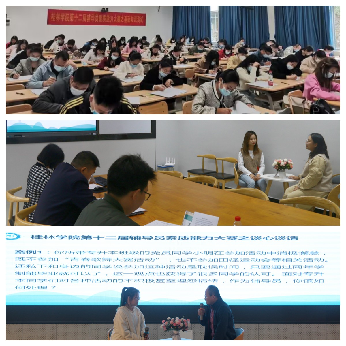 本次大赛中,基础知识测试环节紧紧围绕党的基本理论知识、党和国家关于高校思想政治工作的重要会议及文件精神、辅导员工作理论知识等相关内容,考察辅导员们理论素养和业务知识;案例研讨以“我提问,你回答”的方式进行,每组选手围绕案例共同辨析原因、研讨对策、总结规律,主要考察辅导员分析问题、研判问题、解决问题的综合应用能力。