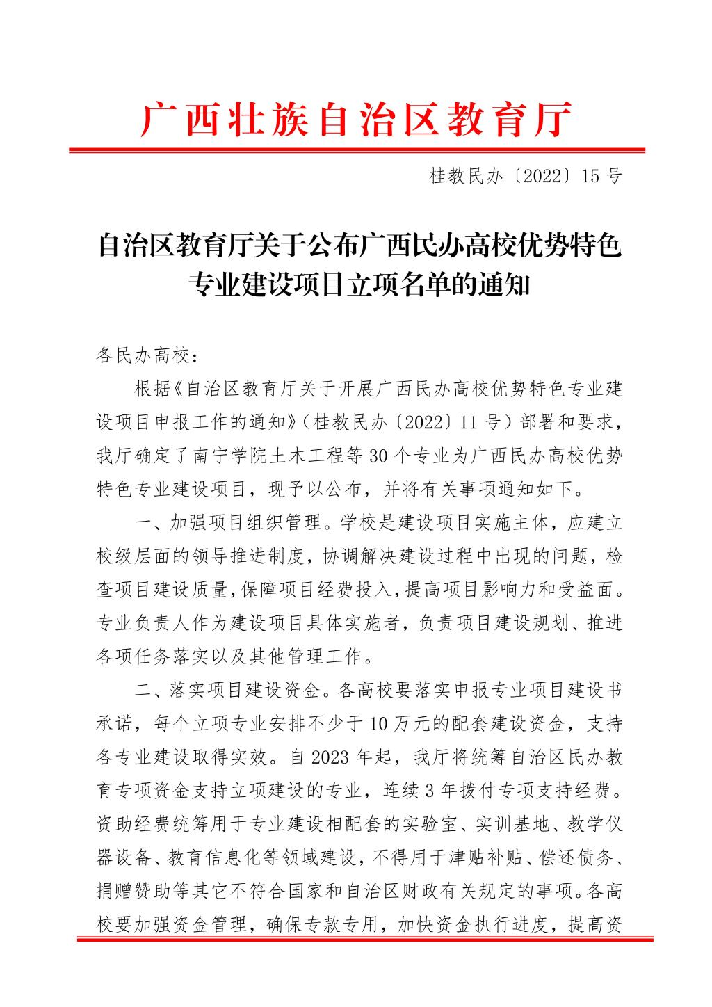 近日,自治区教育厅下发了《关于公布广西民办高校优势特色专业建设项目立项名单的通知》(桂教民办〔2022〕15号),我校软件工程和学前教育等2个专业获批立项。