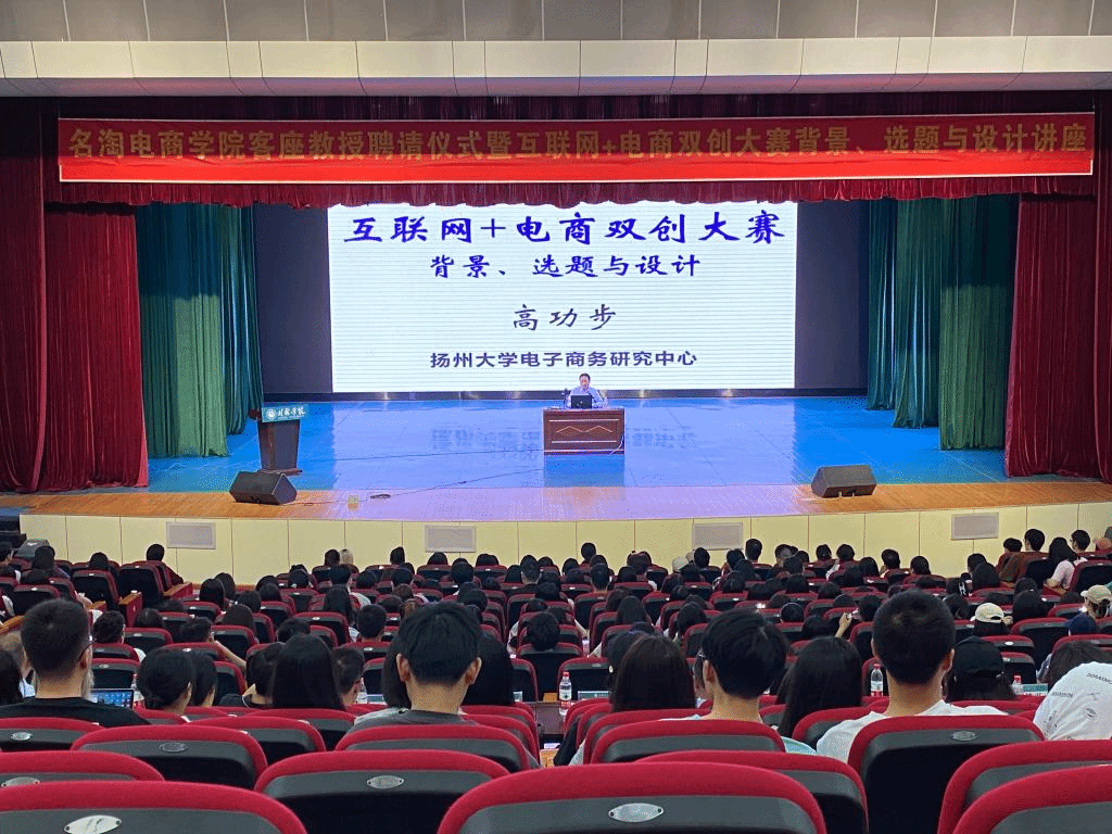 为进一步加强与国内学术界专家学者的合作与交流,推进应用型学科专业和师资队伍建设,4月20日上午,学校在弘善讲堂举行聘请扬州大学电子商务研究中心执行主任高功步为我校客座教授仪式暨“互联网+电商三创大赛背景、选题与设计”专题讲座。学校副校长杨庆庆,浙江名淘投资控股集团总裁、名淘电商学院副院长江战出席活动,学校教务与产教融合处负责人、名淘电商学院领导班子以及师生代表300余人参加了活动。