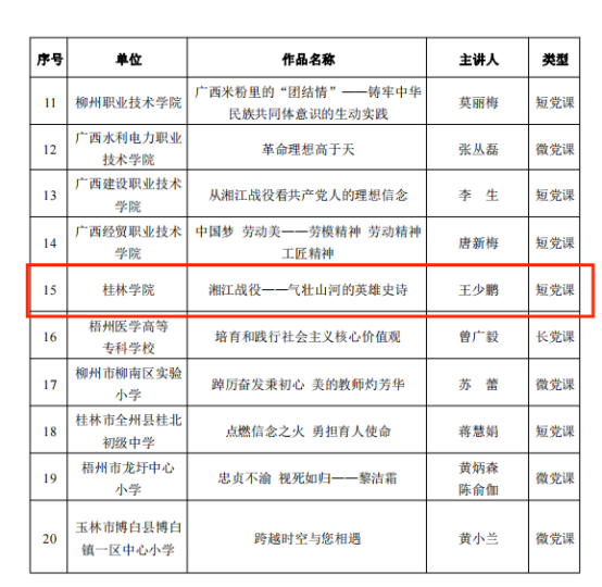 近日,自治区党委教育工委公布2022年度全区学校“优秀党课”和“党员教育好讲师”评选结果,我校理工学院学生党支部书记王少鹏老师的短党课《湘江战役——气壮山河的英雄史诗》获得2022年度全区学校“优秀党课”一等奖。