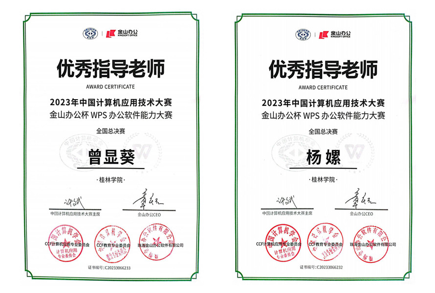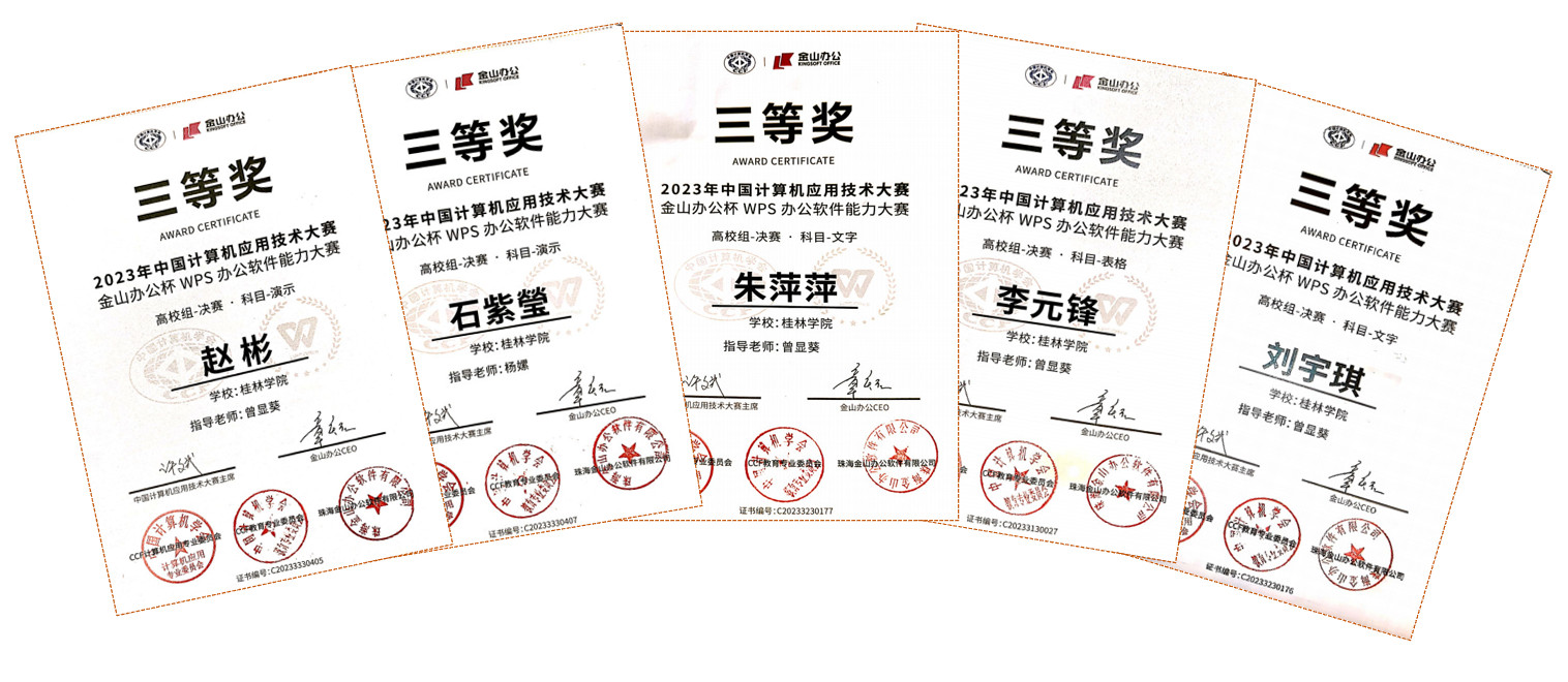 7月17日,中国计算机应用技术大赛-金山办公杯WPS办公软件能力大赛全国总决赛在江苏省苏州市CCF业务总部落下帷幕。理工学院、管理工程学院及金融与法律学院共5名学生朱萍萍、赵彬、石紫瑩、刘宇琪、李元锋代表我校参加本次大赛并获得了相应赛道的三等奖,我校理工学院教师曾显葵、杨嫘获全国总决赛“优秀指导老师”,桂林学院获全国总决赛“优秀组织”奖。