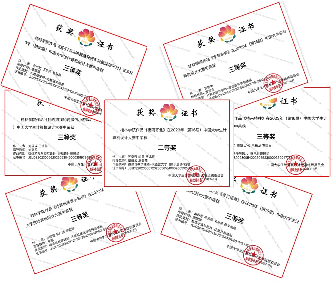 近日,2023年(第16届)中国大学生计算机设计大赛圆满落幕。我校“夜雨寄北”、“我的猫我的药微信小游戏”、“基于Flink的智慧交通车流量监控平台”等7件作品分别获得微课与教学辅助、数媒游戏与交互设计、大数据实践赛等5个不同类别的二等奖和三等奖,获奖类别覆盖面广,获奖数量高于区内同类院校。