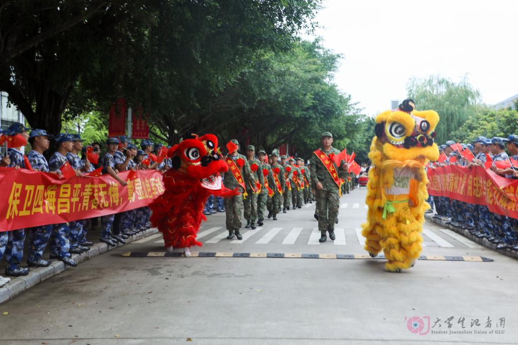 欢送会后,雁山区全体新兵到校进行巡游。校舞狮队领头,新兵队伍步伐铿锵、气宇轩昂。2023级新生早早等候在学校环道两旁,气势如虹地喊着口号,表达对新兵们敬佩与赞美之情。