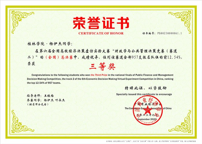 近日,全国高校经济决策虚仿实验大赛顺利落幕,金融与法律学院参赛学生在赛道二:财政学与公共管理决策竞赛中喜获佳绩。通过积分赛、区域赛层层选拔,我校参赛选手一路过关斩将进入全国总决赛,并取得二等奖1项(宋烨豪团队),三等奖2项(杨伊杰团队、李世华团队)的历史好成绩。
