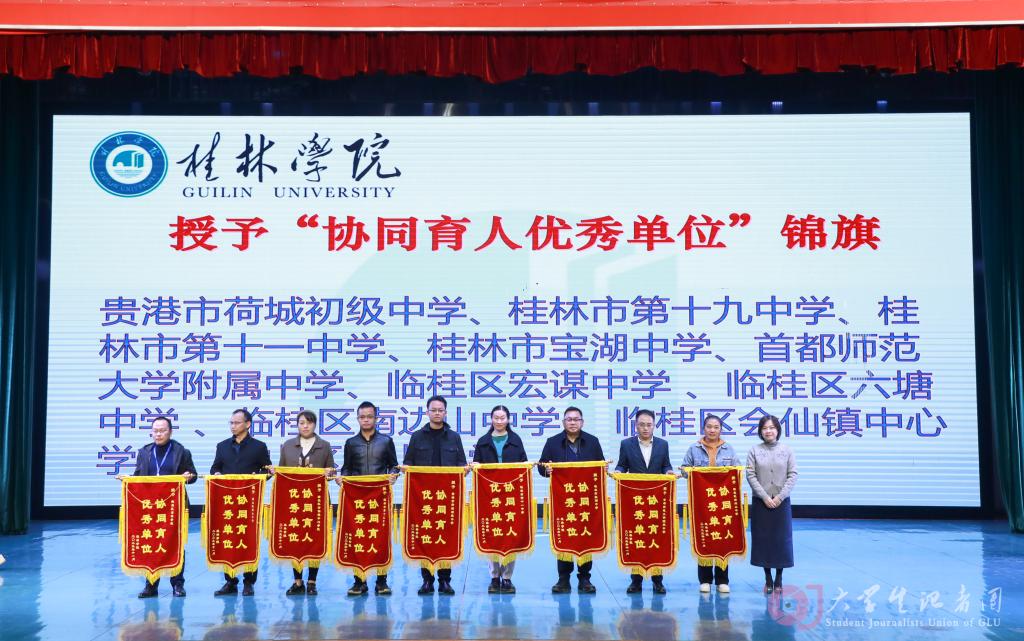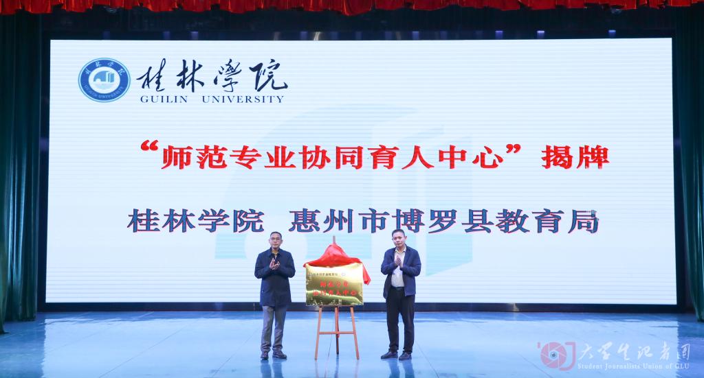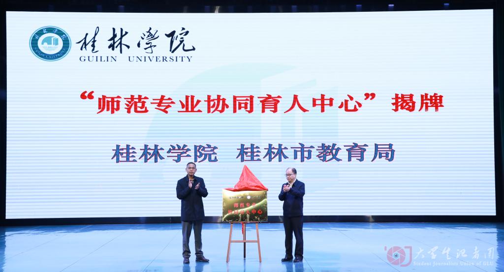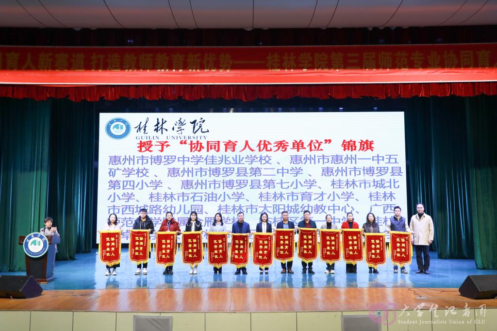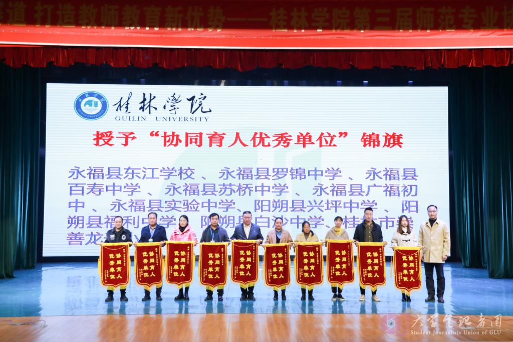开幕式上,杨树喆、陈念进、张怀伟分别为我校与桂林市教育局、广东惠州市博罗县教育局共建的“师范专业协同育人中心”揭牌。邓志平、祝芸芸代表我校向40个被评为“师范专业协同育人优秀单位”的县(区)教育局、校外实践教学基地(学校)颁发锦旗。
