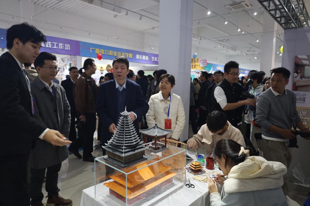 何玲对我校学子在开幕式上的精彩展示表示肯定,充分展现了桂院学子的青春活力。随后参观了在广西师范大学举办的大学生艺术实践工作坊展览,全区共有16个工作坊入围现场展示,我校王瑞、卢春辰、刘鹏三位老师指导的“木构学生艺术实践工作坊——模型艺术赋能美丽乡村”工作坊参加现场展示。