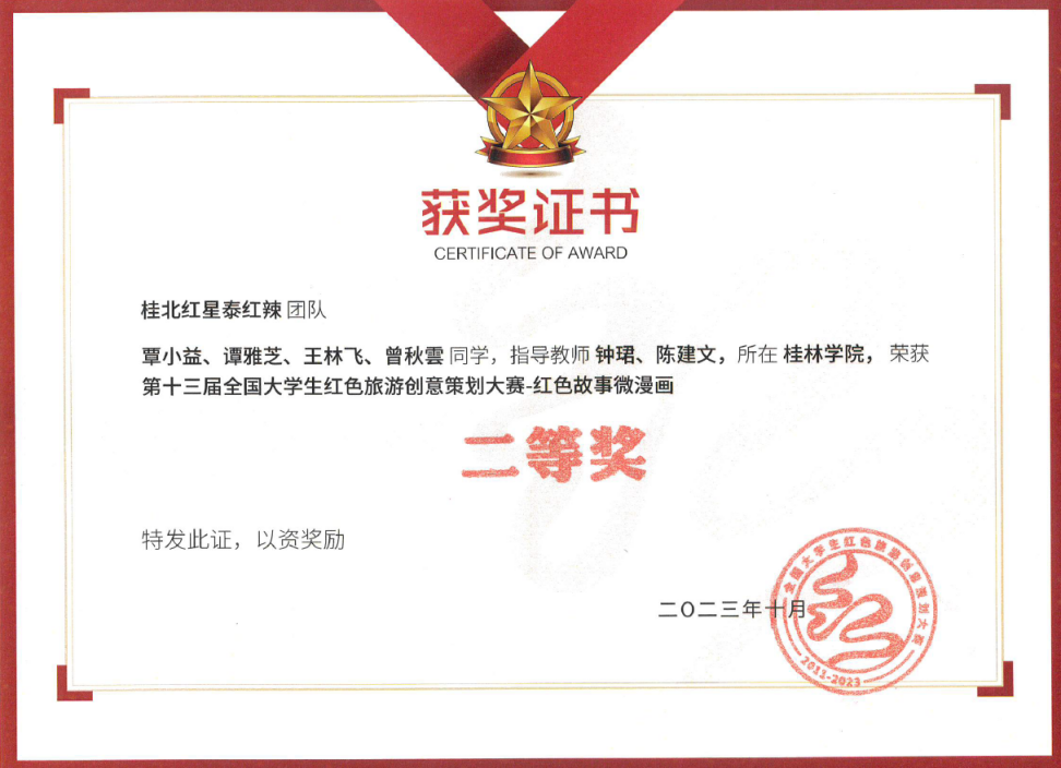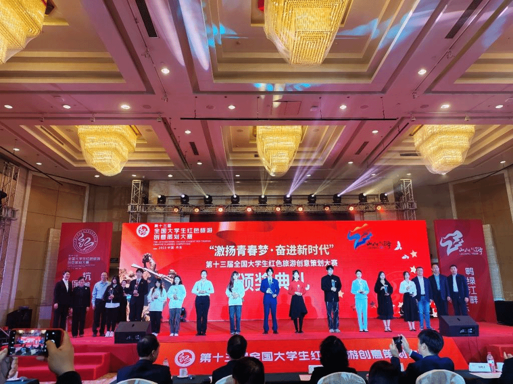 近日,由文化和旅游部资源开发司联合辽宁省文化和旅游厅、丹东市人民政府、北京第二外国语学院共同举办的第十三届全国大学生红色旅游创意大赛现场决赛及颁奖典礼在辽宁省丹东市落下帷幕。经过激烈角逐,由我校钟珺老师、陈建文老师指导的“桂北红星泰红辣”团队荣获全国总决赛二等奖,钟珺、陈建文等两位老师获评“最佳指导教师奖”,取得我校在该项赛事上历年最好成绩。此外,钟珺、陈建文指导的“旅梦人”团队,胡又嘉、程欣指导的“逐梦小队”团队获华南赛区二等奖。
