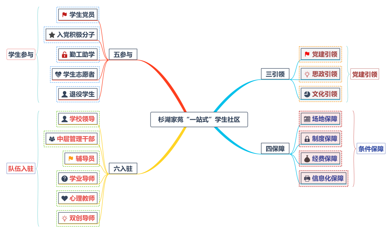 学生社区突出党建引领,强化协同育人,20支实体、功能型党支部,18个实体、功能型团支部建在学生社区,充分发挥党团组织在社区建设的先锋模范和战斗堡垒作用;队伍进驻学生社区,推进服务下沉,推动校领导、中层管理干部、辅导员、专任教师、心理健康教育教师、双创导师等6支队伍常态化深入社区,了解学生思想动态、生活状态、发展需求,切实解决学生实际问题;学生积极参与社区管理,提升自我服务意识,依托“社区-楼栋-楼层-寝室”四级网格管理体系、学生社区自治管理委员会、朋辈帮扶等机制实现学生社区共建、共享、共治、共育的目标。