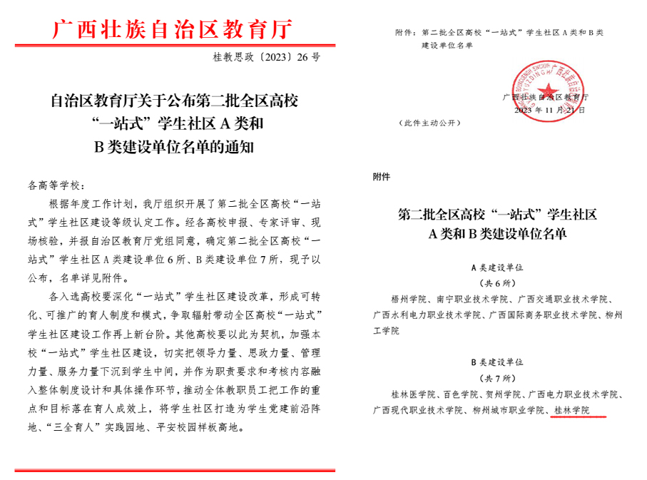 近日,根据自治区教育厅下发的《自治区教育厅关于公布第二批全区高校“一站式”学生社区A类和B类建设单位名单的通知》(桂教思政〔2023〕26号),我校获第二批全区高校“一站式”学生社区B类建设单位,是七所B类建设单位之一,这是我校在“三全育人”工作上取得的又一重要成果。