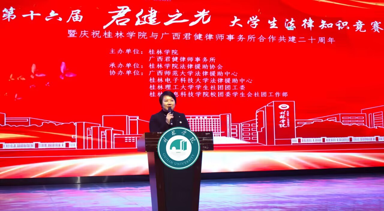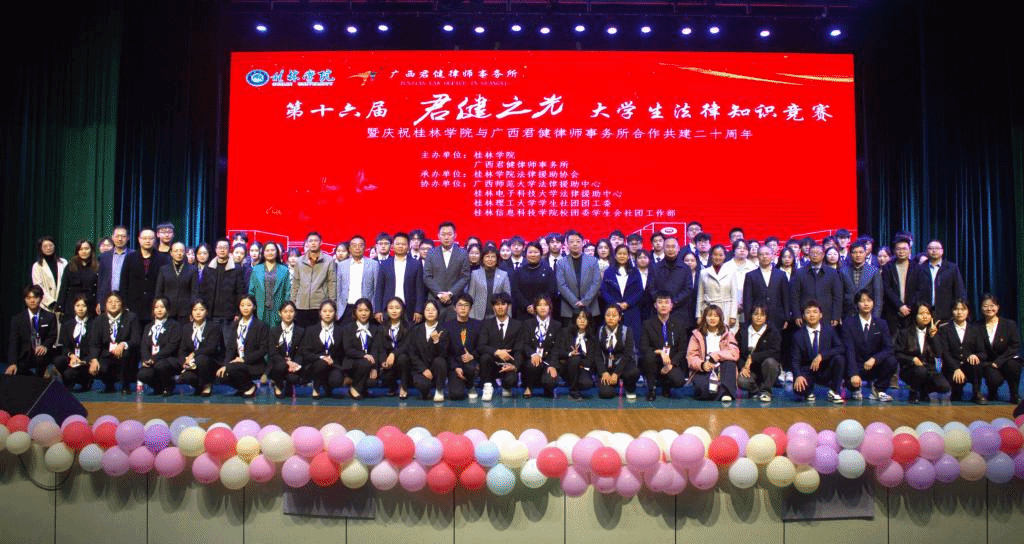 为大力弘扬宪法精神,建设社会主义法治文化,喜迎第十个“国家宪法日”、第六个“宪法宣传周”,近日,由我校和广西君健律师事务所共同主办、学校法律援助协会承办的第十六届“君健之光”大学生法律知识竞赛总决赛暨桂林学院与广西君健律师事务所合作共建二十周年庆祝活动在弘善讲堂隆重举行。