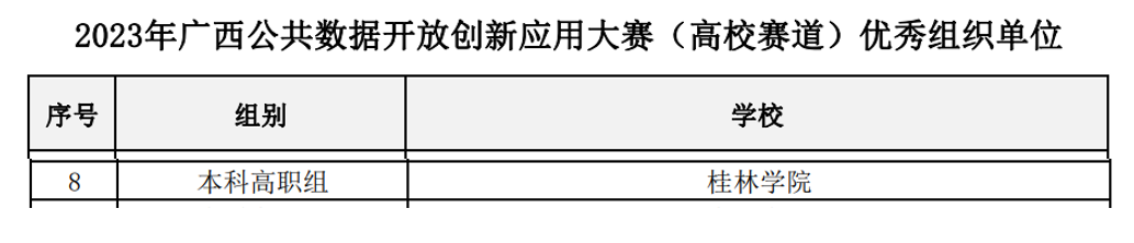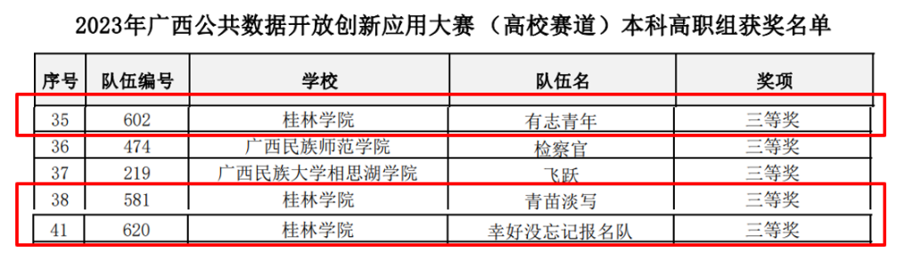 12月10日,2023年广西公共数据开放创新应用大赛获奖名单正式公布,我校学子首次参加该项赛事,在高校赛道中共获得三等奖3项,同时学校获得优秀组织单位奖。