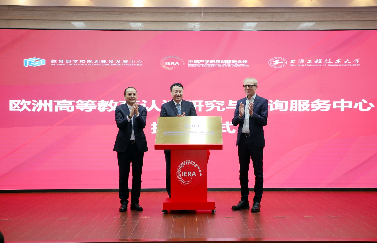 上海工程技术大学校长俞涛,安徽大学党委书记蔡敬民,ASIIN高等教育认证委员会副主席、慕尼黑应用科技大学副校长Pro.Dr.Klaus Kreulich共同为欧洲高等教育认证研究与咨询服务中心揭牌。中心将面向中国高校在国际专业认证方面提供咨询与指导、师生培训、认证专家库的建立等服务。会上,中德产学研用创新联合体秘书处发布了《中国高校专业国际认证行动计划(50计划)》。