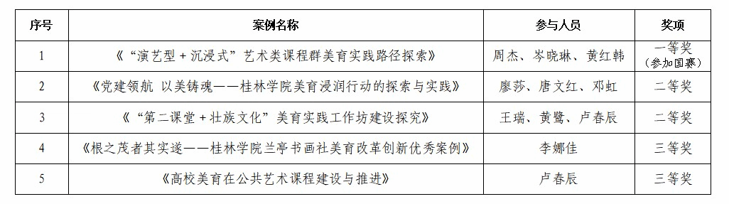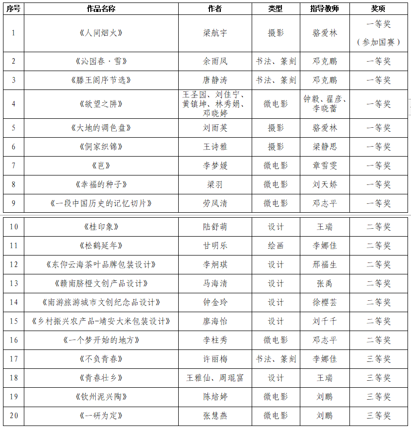 近日,自治区教育厅公布了广西第七届大学生艺术展演活动评审结果。我校共有38件作品获奖,分别为“校长风采奖”1项,一等奖11项,二等奖14项,三等奖12项。其中,我校选送的高校校长书画摄影作品《大地乐章》、学生艺术作品《人间烟火》以及高校美育改革创新优秀案例《“演艺型+沉浸式”艺术类课程群美育实践路径探索》三件作品脱颖而出,被推荐至全国展出,是我校在该项比赛中的历史新突破!同时,学生艺术实践工作坊作品《木构学生艺术实践工作坊——模型艺术赋能美丽乡村》荣获一等奖,为我校在该比赛类别中的历史最佳成绩。据统计,在本次大艺展中,我校荣获奖项数量及被推荐至全国参评的作品数量均创下了我校在该项赛事的历史性佳绩!