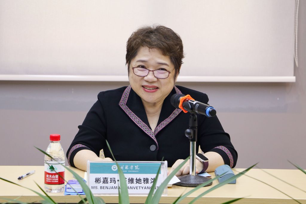 彬嘉玛·塔维她雅浓对学校的热情接待表示感谢,对桂林学院在泰语、汉语国际教育、商务英语等专业合作办学方面的良好合作,以及我校学生积极参加泰王国驻南宁总领事馆举办的广西高校泰语演讲公开赛并取得优异成绩表示赞赏。她表示,泰王国驻南宁总领事馆将致力于持续推进泰中双边的教育文化合作关系,积极开展各类泰中交流活动,进一步加强泰中友好关系。她强调,泰王国驻南宁总领事馆将继续为桂林学院与泰王国高校等的交流合作铺路搭桥,积极促成双边各类高水平的合作项目,共同推动泰中教育强化交流合作高质量发展。