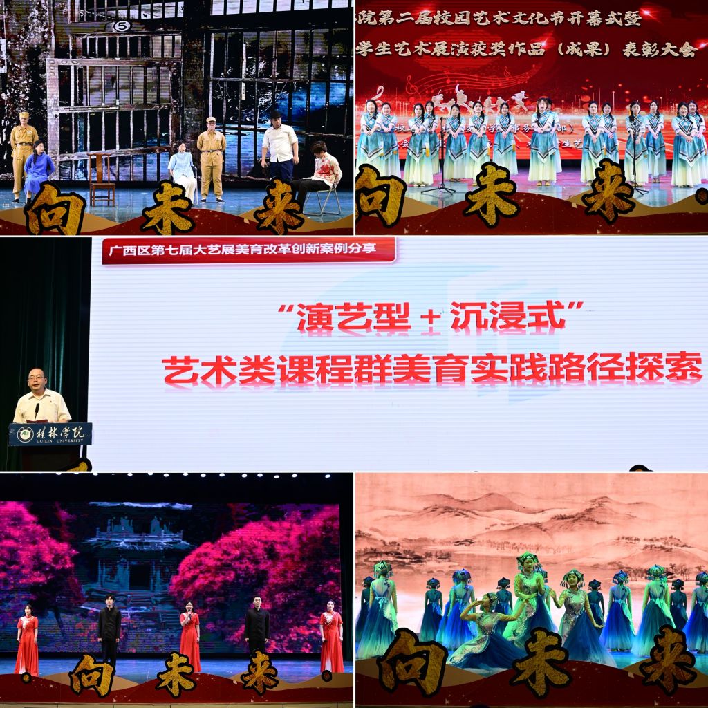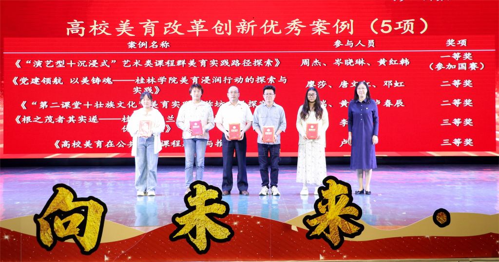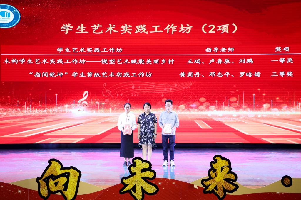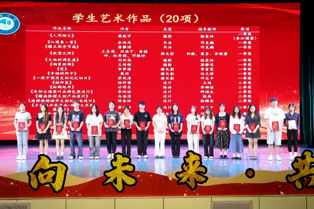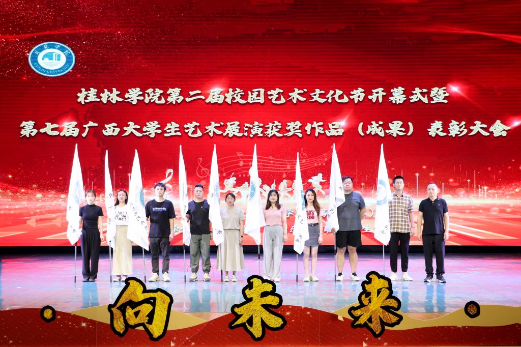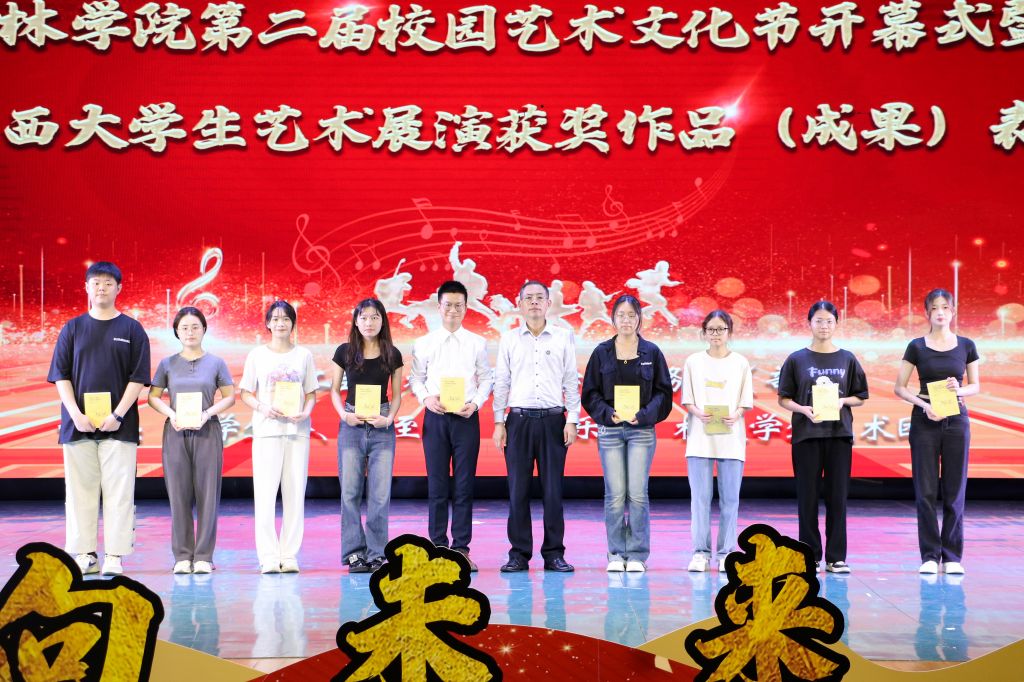 在颁奖环节,诸葛长为第十一届广西文艺创作铜鼓奖获得者杨树喆颁发“董事会特别奖”。唐文红、刘文革、杨庆庆、何玲分别为荣获第七届广西大学生艺术展演“校长风采奖”“高校美育改革创新优秀案例”“艺术表演类作品”“学生艺术实践工作坊”“学生艺术作品”等奖项的个人或团队代表颁发荣誉证书。杨树喆将其著作《民众口头创作与族群文化品性》(第十一届广西文艺创作铜鼓奖获奖作品)赠予师生代表。