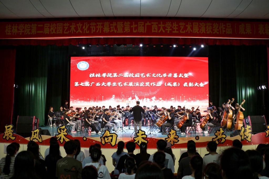 杨树喆在致辞中首先向在第七届广西大学生艺术展演活动中获奖的作者和指导老师们致以热烈的祝贺,向长期以来为学校美育工作辛勤付出的师生们致以崇高的敬意。他表示,自2021年5月独立设置以来,学校通过多措并举加强美育和公共艺术教育工作,广大师生在自治区人民政府第十一届广西文艺创作铜鼓奖评审和第七届广西大学生艺术展演活动中取得了不凡的成绩。这既是对学校多年来美育工作的肯定,也是学校师生坚持崇德尚艺,紧跟时代步伐,弘扬优秀传统文化的生动体现。他勉励全校师生以本次活动为契机,深入总结经验、锤炼精品,携手共进,进一步深化学校美育工作,构建形成全覆盖、多样化、高质量、具有“至善”校园文化特色的美育体系。