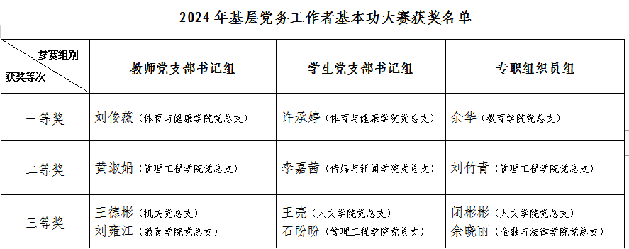 大赛由学校党委组织部主办,设有教师党支部书记组、学生党支部书记组和专职组织员组共3个组别,分为党务知识测试、微党课讲授、党建工作案例展示3个环节。比赛过程中,参赛选手围绕强化基层党组织政治功能、提升党组织组织力、严格党员教育管理、提高思想政治工作能力等主题,聚焦基层党建工作的重点难点问题,呈现了各基层党组织在党建业务一融双高和党建品牌创建的好经验、好做法。经过激烈角逐,活动评出一等奖3名、二等奖3名、三等奖6名。