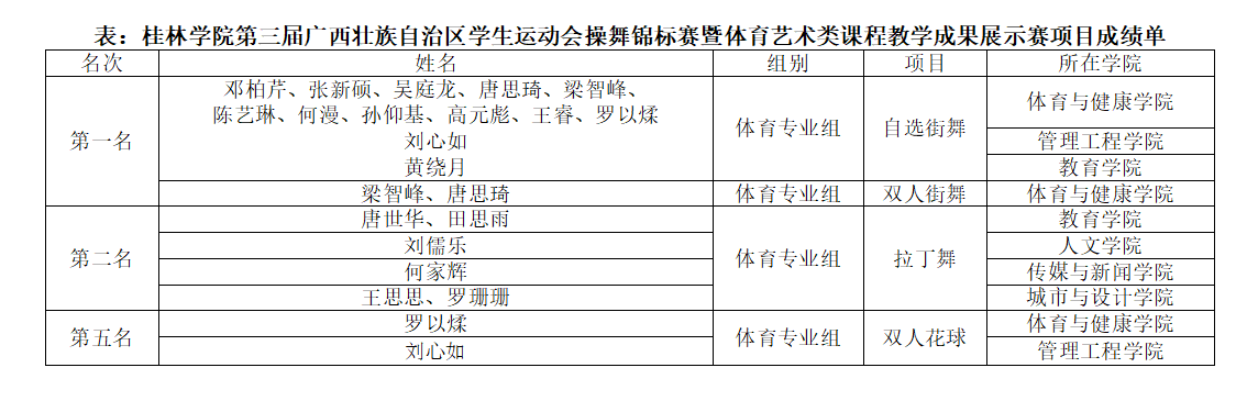 本次比赛我校魔力啦啦操队和拉丁代表队二十余名学生参加了其中四个项目的竞赛,经过4场角逐,喜获体育专业组-自选街舞金奖、体育专业组-双人街舞金奖、体育专业组-拉丁舞银奖、体育专业组-双人花球第5名四项佳绩。具体成绩单如下表: