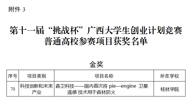 自本届“挑战杯”启动以来,校团委认真落实上级文件及学校党委部署要求,联合创新创业学院,在历届双创类赛事的基础上,充分挖掘资源,整合力量,加强全程指导,切实提升备赛作品质量。在本次赛事中,我校理工学院项目《森卫科技——国内首次将 pie—engine 卫星遥感技术用于森林防火》荣获自治区级金奖。本项获奖是该项目自去年荣获第九届中国国际大学生创新大赛广西区赛选拔赛金奖之后又一次取得突破,理工学院项目团队不断打磨提升,新申请获批专利2项、软件著作权8项,新发表科技论文4篇,为冲击更高层次比赛奠定坚实基础。