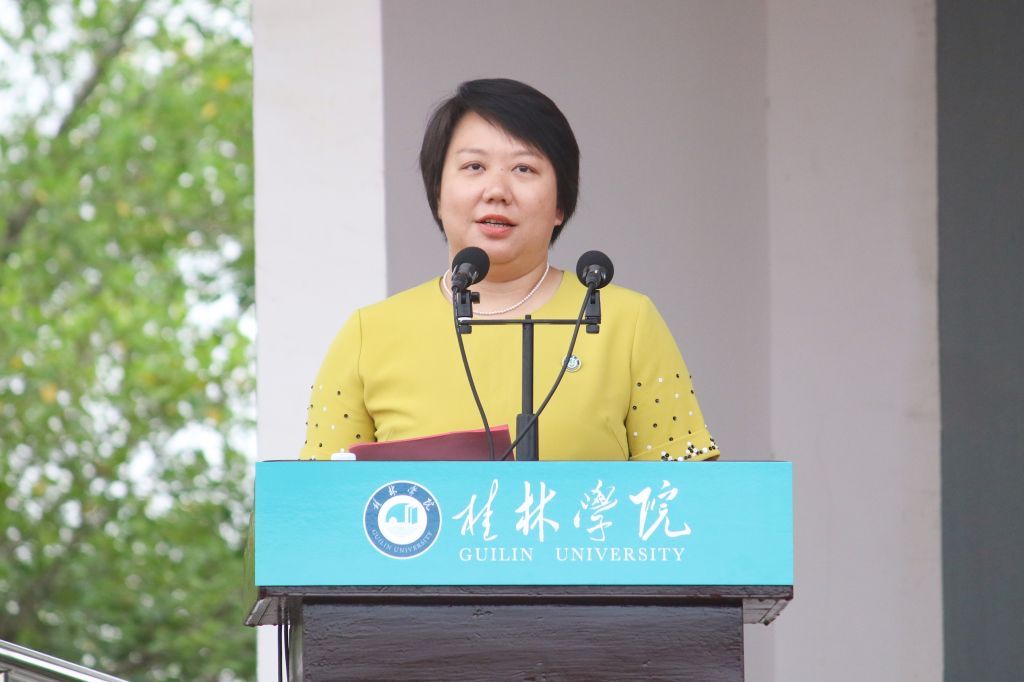 典礼展示了校训、校徽及校歌,举行了新生佩戴桂林学院徽章仪式。校徽是学校精神积淀与文化追求的一种象征,胸前闪耀的校徽,是肩上责任,是心中理想,他们从此刻开始同享“桂院人”的身份,共担桂院人的责任与使命,把青春融入党和人民事业。