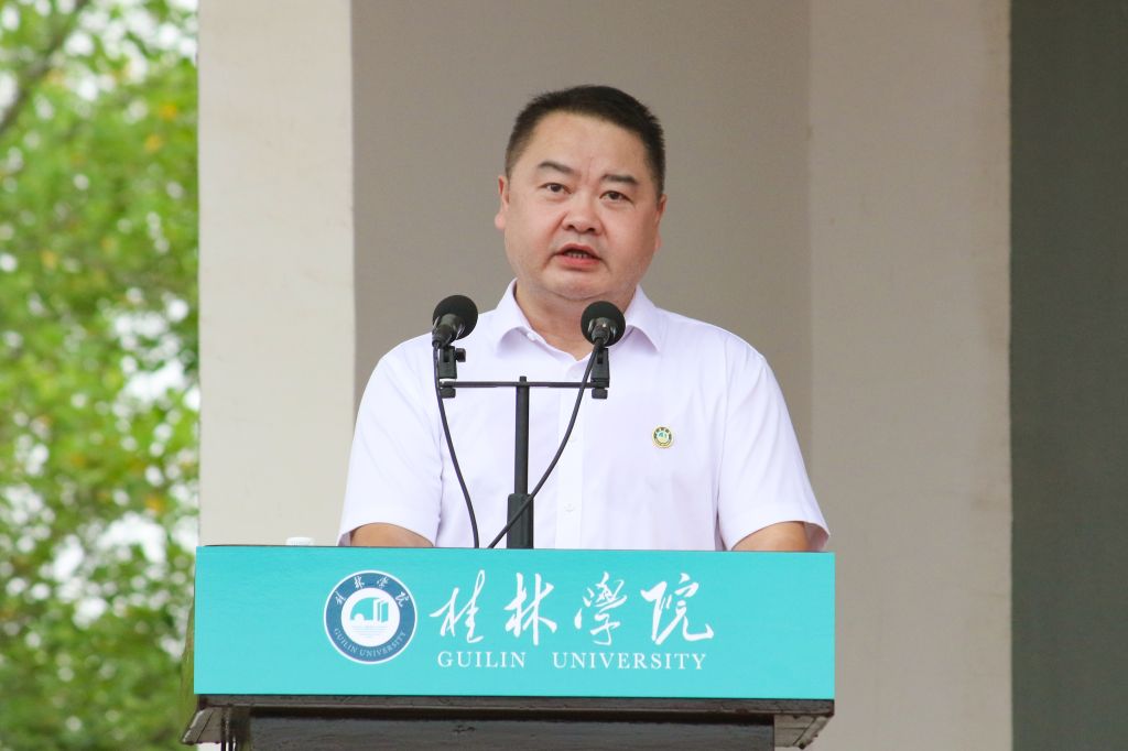 陶毅代表学校董事会对全体新生表示热烈的欢迎和祝贺,向一路指引陪伴新生的家长、师长致以崇高敬意。他表示在桂林市委、市政府的大力支持下,学校一定会越办越好,祝愿同学们学有所成,实现自己的梦想。