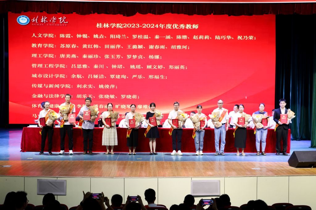 卢新华代表市委、市政府向受表彰的优秀个人和先进集体(团队)表示祝贺,向全校教职工致以诚挚的节日问候。他高度肯定了桂林学院自2021年转设以来取得的成绩,并根据市委书记周家斌的指示要求,就进一步做好学校教育教学各项工作提出了三点希望:一是希望桂林学院进一步深入学习贯彻落实习近平总书记关于教育的重要论述,始终坚持正确的办学方向,准确把握市委、市政府对桂林学院的发展定位,办好人民满意的城市型大学,切实加强学校各项管理工作,营造安全稳定和谐的校园环境。二是希望全体教职工坚守立德树人初心,勇担教书育人使命,为打造世界级旅游城市,奋力谱写中国式现代化桂林篇章,作出新的更大贡献。三是希望同学们坚定理想、志存高远,勤奋学习、增强本领,在打造桂林世界级旅游城市中激荡青春力量、展现青春风采、成就精彩人生!