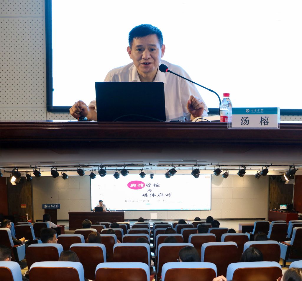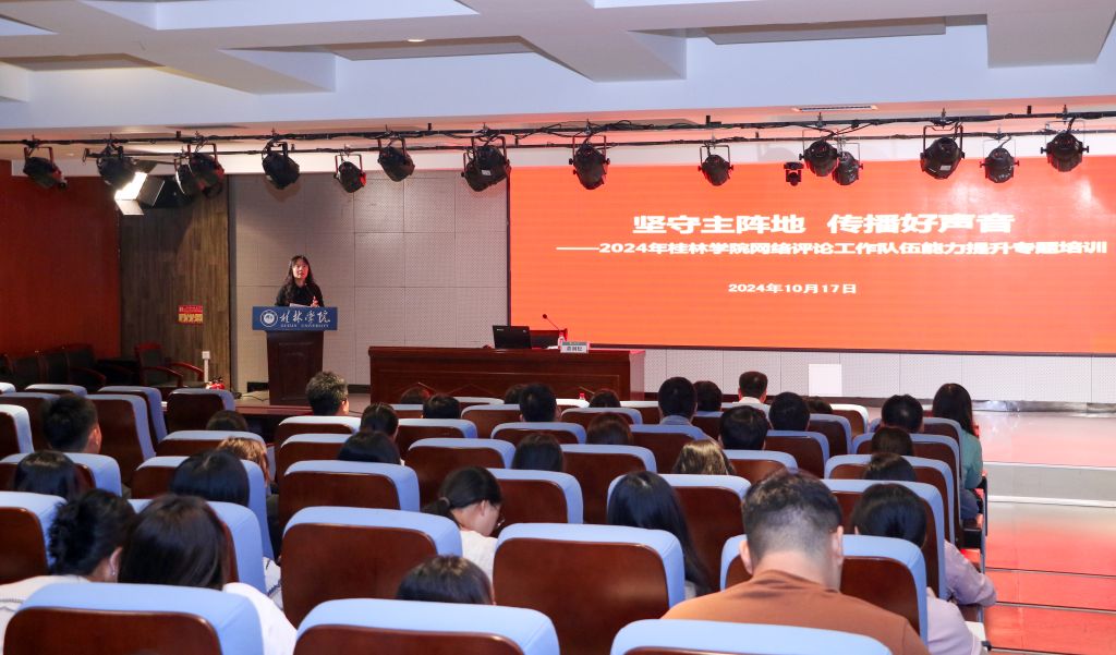 10月17日上午,学校“坚守主阵地、传播好声音”2024年网络评论工作队伍能力提升专题培训在至善讲堂成功举办。本次专题培训由校党委副书记黄润松,桂林市委宣传部二级调研员汤榕主讲。全校基层宣传通讯员、网络评论员及党委工作部相关人员参加培训。黄润松作专题培训动员讲话。培训由党委工作部负责人主持。