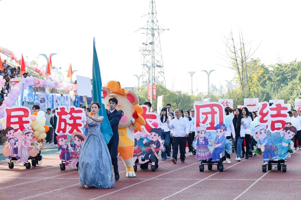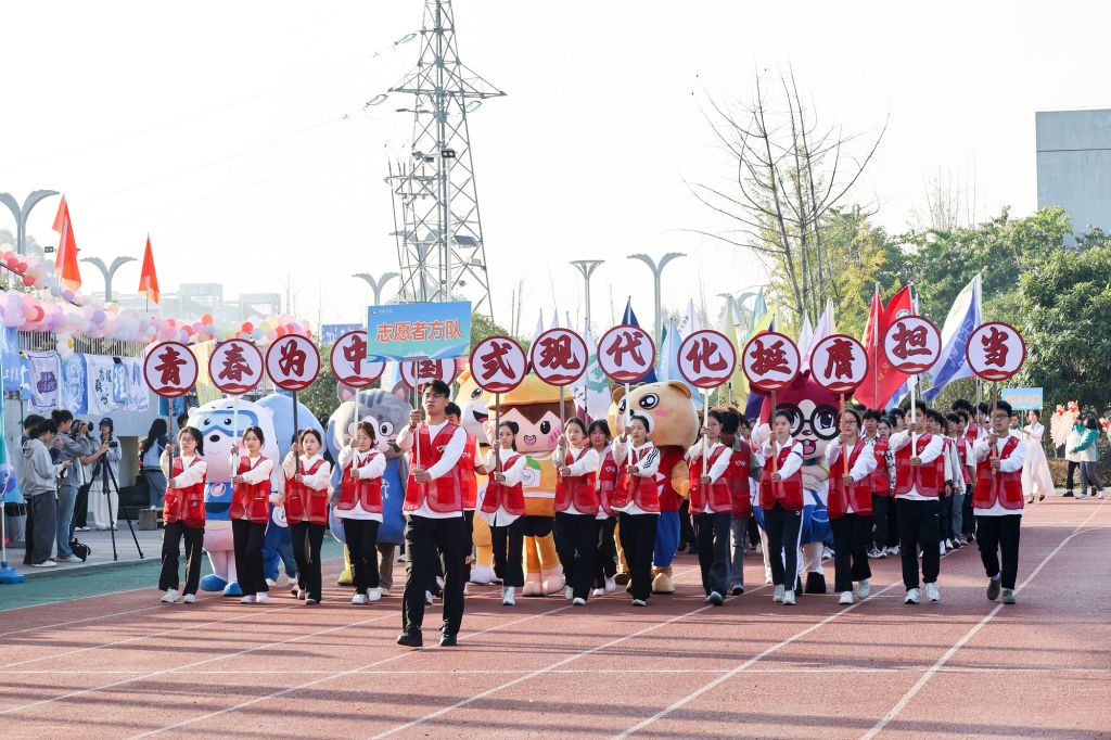 开幕式现场,学校国旗护卫队,裁判员方队,志愿者方队,各二级学院、各单位方队精神抖擞,在激昂的运动员进行曲中依次亮相,展现了桂院人昂扬向上的精神面貌。各方阵结合单位和专业特色,奉献了一个个别出心裁的创意方队表演,表达了桂院师生不负时代重托、奋力书写为中国式现代化挺膺担当桂院篇章的赤子之情。大型青春舞团体操表演将开幕式推向了高潮,同学们精神饱满、动作整齐、舞姿轻快、笑容自信,处处洋溢着青春的风采。