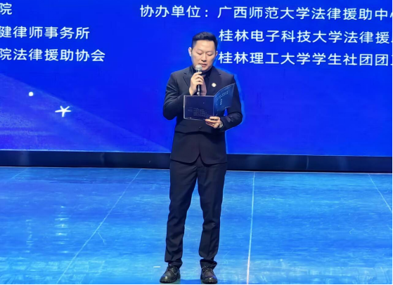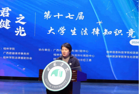 为深入学习贯彻党的二十届三中全会精神,深化宪法学习宣传,学校于12月5日在弘善讲堂成功举办了第十七届“君健之光”大学生法律知识竞赛。此次活动旨在弘扬宪法精神,以习近平法治思想为指导,深入学习习近平总书记关于宪法的重要论述,生动讲述中国法治故事。学校副校长杨庆庆,广西君健律师事务所市场运营总监张福东及其团队成员,以及教务与产教融合处、金融与法律学院负责人等嘉宾出席了当晚活动。来自桂林学院、广西师范大学、桂林电子科技大学、桂林理工大学、桂林信息科技学院、桂林旅游学院的选手在竞赛中激烈角逐。