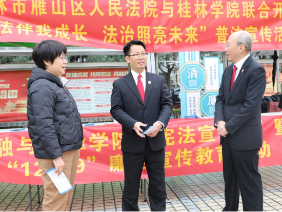 为深入贯彻落实习近平法治思想,在“12·9”国际反腐败日来临之际,12月6日,学校与雁山法院隆重举办了以“清廉相伴,法治同行”为主题的“清廉桂院”建设“12·9”廉洁宣传教育活动。校纪委书记康庚莲,雁山法院党组书记、副院长、代院长苏革,法院政治部主任廖婷,校团委书记、校纪委办公室主任、金融与法律学院领导班子、人文学院党总支书记、雁山法院法官代表及学院师生代表一百余人参加活动。