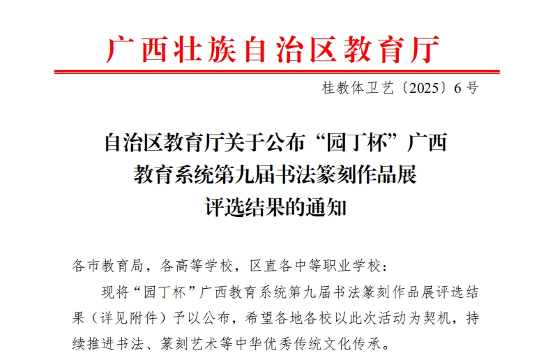 近日,自治区教育厅公布“园丁杯”广西教育系统第九届书法篆刻作品展评选结果,我校学子陈开颖、谢伊宛作品入选作品展。