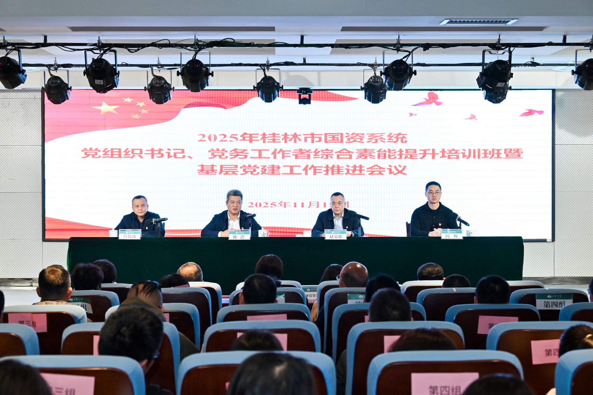 11月12日,由桂林市国资委主办、学校承办的2025年桂林市国资系统党组织书记暨党务工作者综合素能提升培训班开班仪式在至善讲堂举行。本次培训旨在学习贯彻党的二十届四中全会精神和习近平总书记关于党的建设的重要思想,提升国资系统党建工作队伍综合素养,推动国企党建与业务深度融合。桂林市委组织部副部长陈浩,市国资委党委书记、主任赵家维,市国资委党委委员、副主任闪辉,桂林市国资系统各企业的主要领导,学校校长吴郭泉及其他在家校领导、财务总监,全体参训学员约140余人参加开班仪式。开班仪式由闪辉主持,桂林城建集团党委副书记、副董事长、总裁肖笛波致欢迎词。