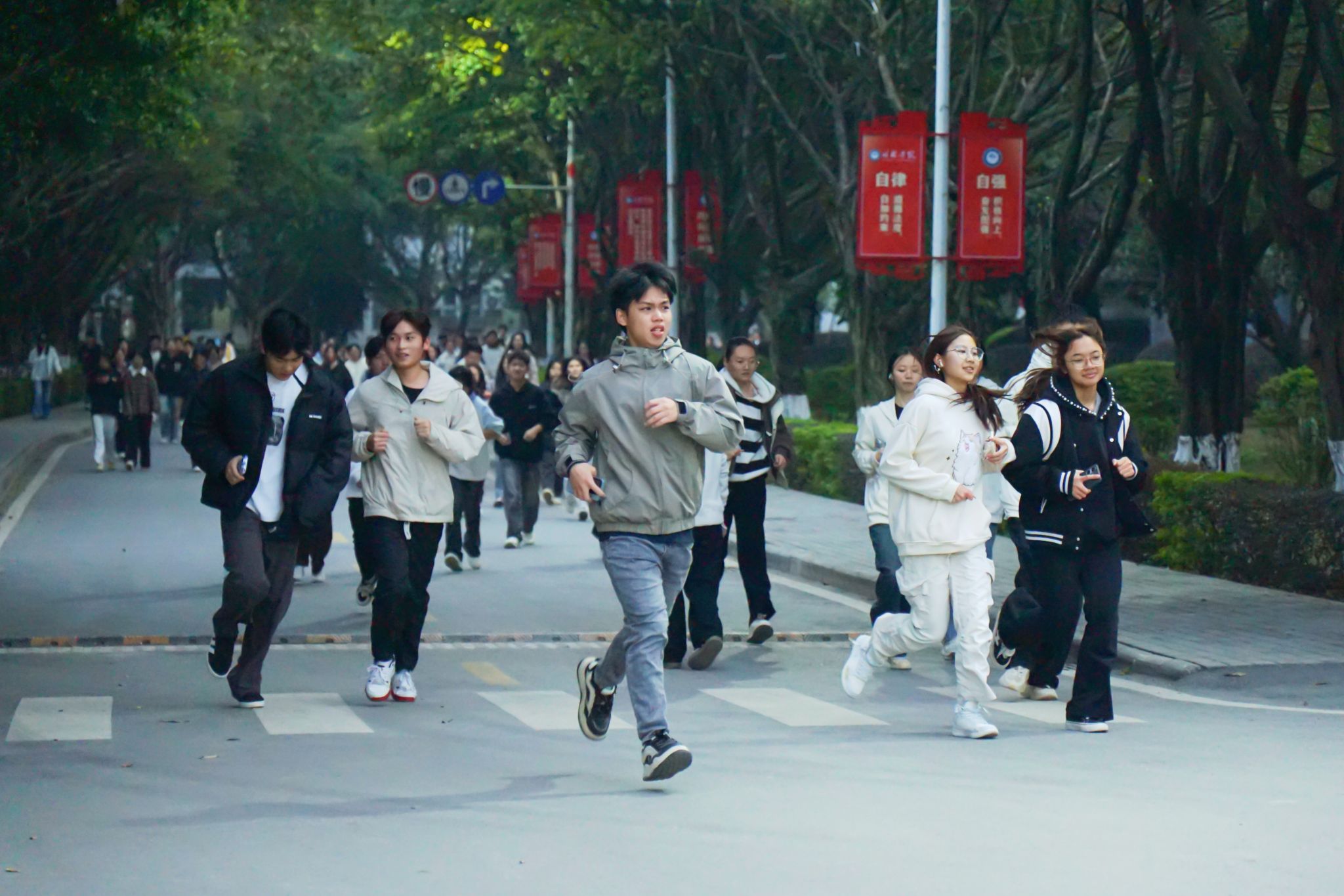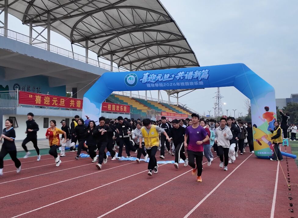 岁序常易,华章日新。当冬日暖阳斜照在田径场的绿茵上,师生们精神抖擞、整齐列队,站在岁末年初的交汇点上,满怀对过去的感念与对未来的憧憬。蒋毅宣布活动开幕并与各二级学院党总支副书记共同为活动鸣枪发令,清脆的枪声划破长空,校园欢乐跑正式起跑。同学迈开步伐,或奋力冲刺展现拼搏风采,或并肩前行彰显团队的互助与温情,寒风虽劲,却难挡师生高涨的热情,每一张脸庞都洋溢着自信与快乐,每一个脚步都充满着力量与希望,大家用奔跑的方式丈量校园的美丽,用热情的笑容迎接新年的到来。奔跑的身影穿梭于校园之中,跃动的步伐传递出蓬勃的朝气,诠释着桂院人强健体魄、坚韧意志与积极进取的精神品格。