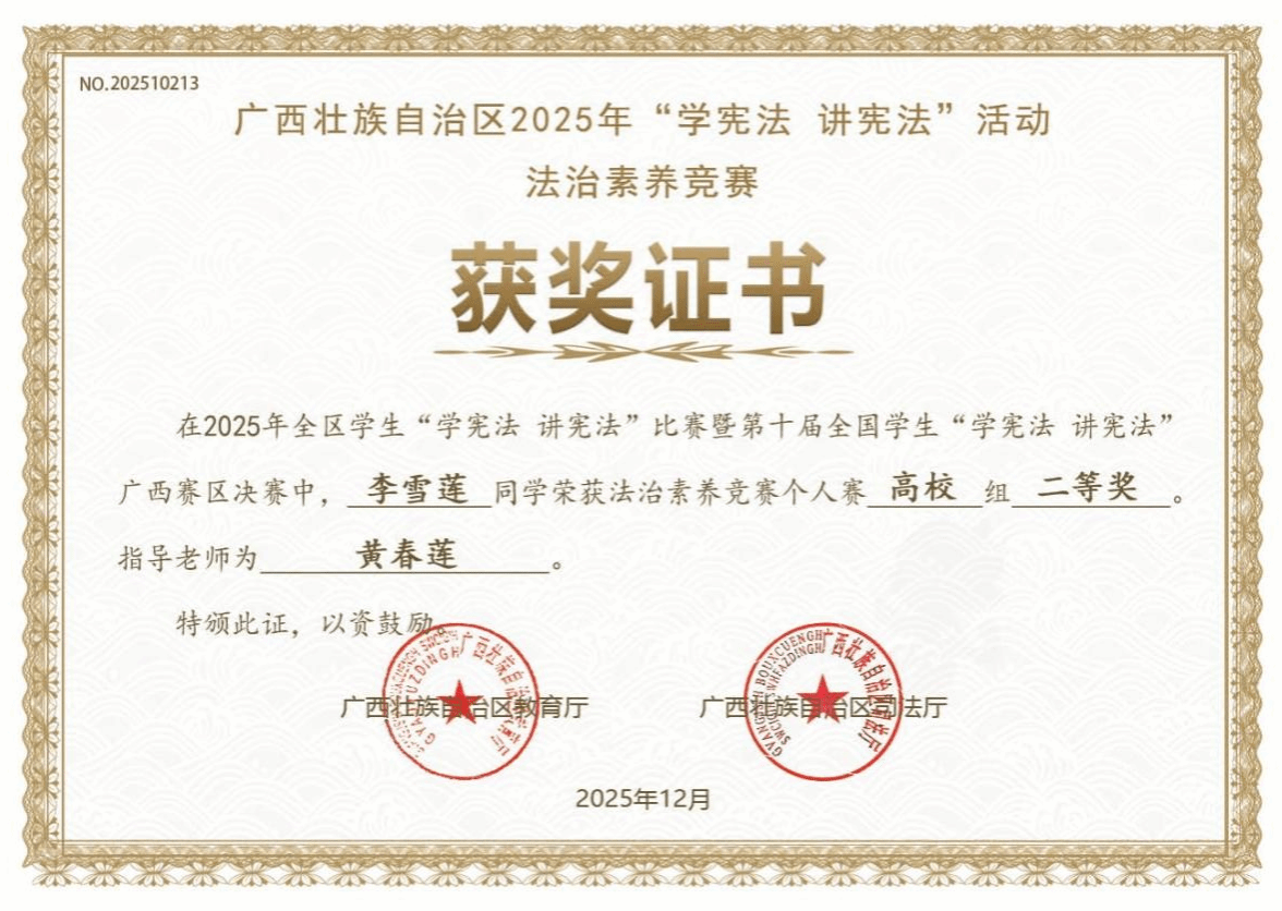 近日,自治区教育厅、自治区司法厅联合公布了2025年全区学生“学宪法 讲宪法”系列活动各项比赛获奖结果。我校师生在比赛中表现突出,斩获多项荣誉,充分展现了我校法治教育的丰硕成果和师生良好的法治素养。
