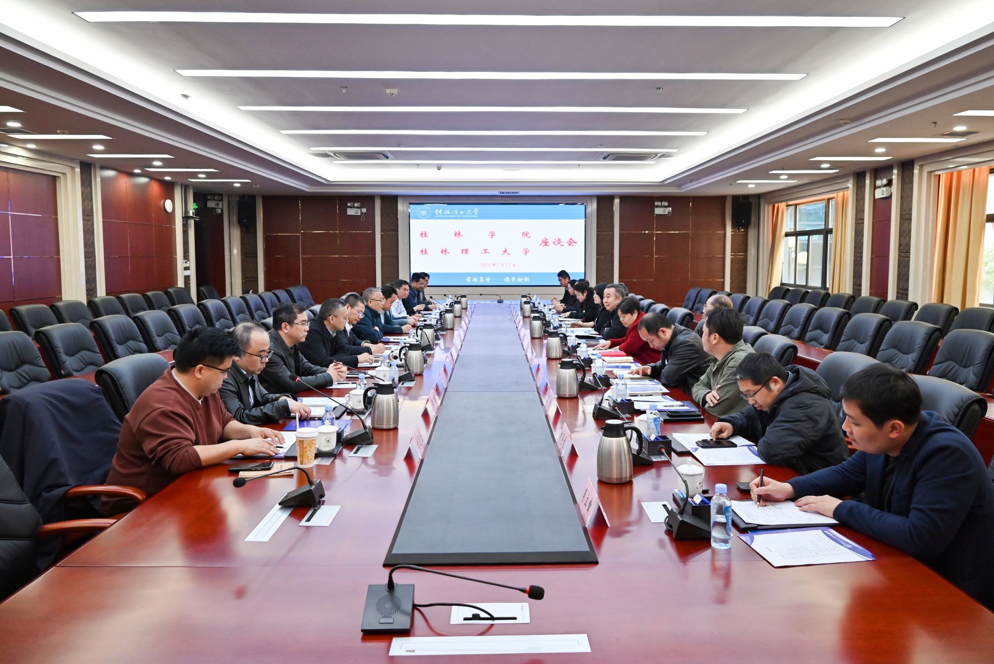 为进一步深化校际合作,学习借鉴桂林理工大学在学科平台建设、科研创新、社会服务、基础设施建设及人才培养等方面的先进经验,推动学校内涵式高质量发展,3月12日下午,校长吴郭泉率领相关职能部门、二级学院负责人赴桂林理工大学开展交流学习活动。桂林理工大学校长王敦球热情接待并出席交流座谈会。学校副校长何玲,桂林理工大学副校长曾繁荣及党委(校长)办公室、人事处、教务处、发展规划处等相关职能部门、二级学院负责人参加交流座谈。