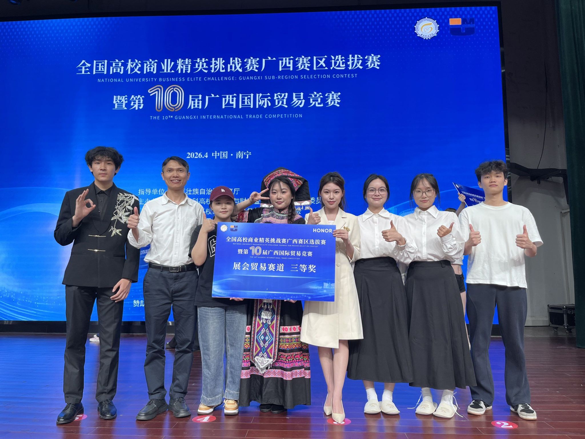 此次竞赛成绩的取得,是学校长期以来坚持“以赛促教、以赛促学、以赛促改、以赛促强”办学理念的生动体现,也是学校深化产教融合、推进学科专业建设与产业需求无缝对接的重要成果。据悉,今年恰逢广西国际贸易竞赛举办十周年,自该竞赛创办以来,学校累计斩获一、二、三等奖共计40余项,在区内高校中名列前茅,充分彰显了学校在贸易类人才培养领域的雄厚实力和鲜明特色。