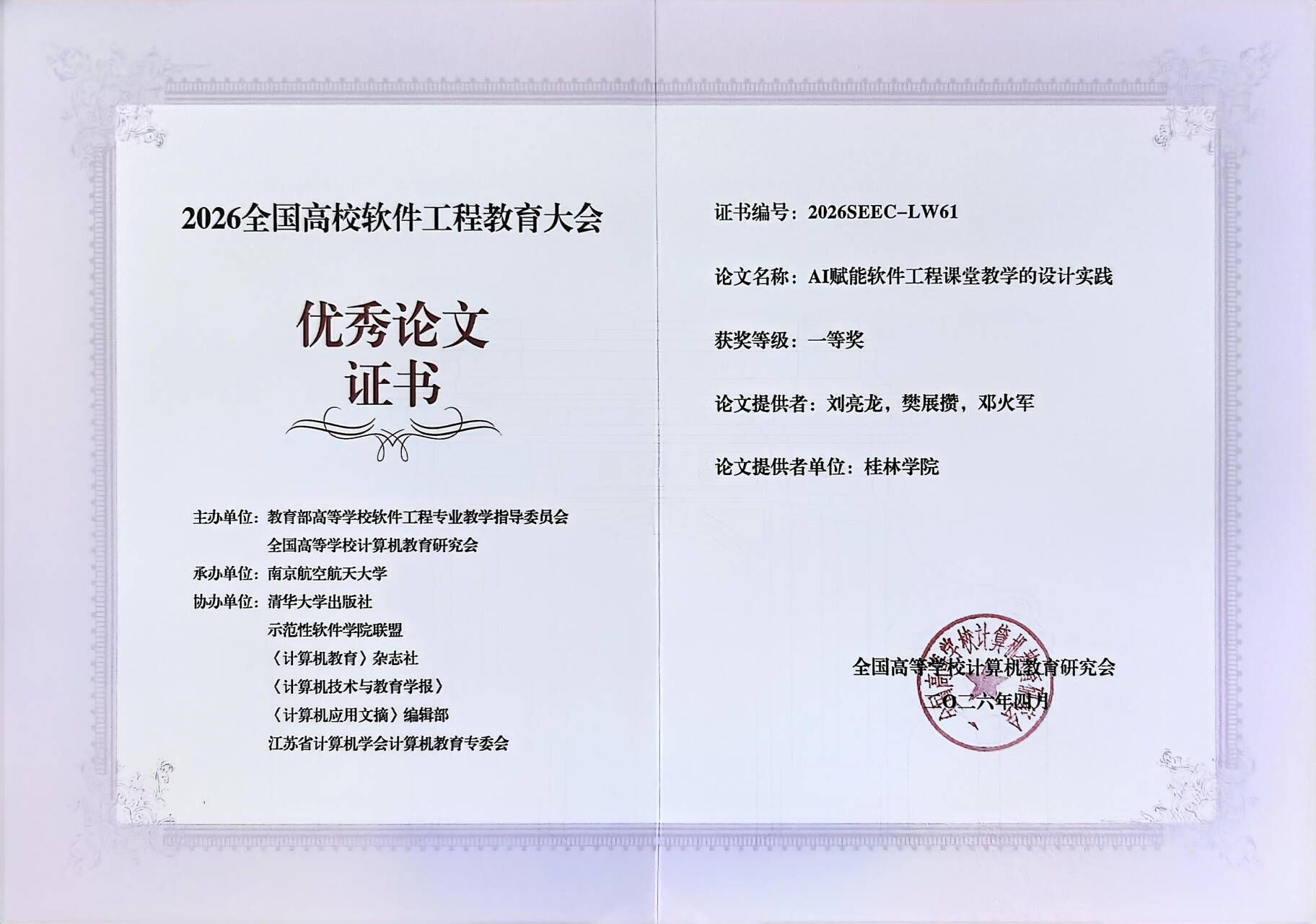 4月19日,2026全国高校软件工程教育大会在南京圆满落幕。本次大会以“智赋软工・育见新程”为主题,由教育部高等学校软件工程专业教学指导委员会主办,汇聚了全国软件工程领域的知名专家学者与一线教师,围绕前沿教学改革与人才培养模式开展深入交流与成果评审。我校信息工程学院/软件与信息技术产业学院申报的校企协同成果《AI赋能软件工程课堂教学的设计实践》,在全国众多参赛作品中脱颖而出,一举荣获优秀论文一等奖,充分展现了我校在软件工程教育改革与产教融合方面的突出成效。