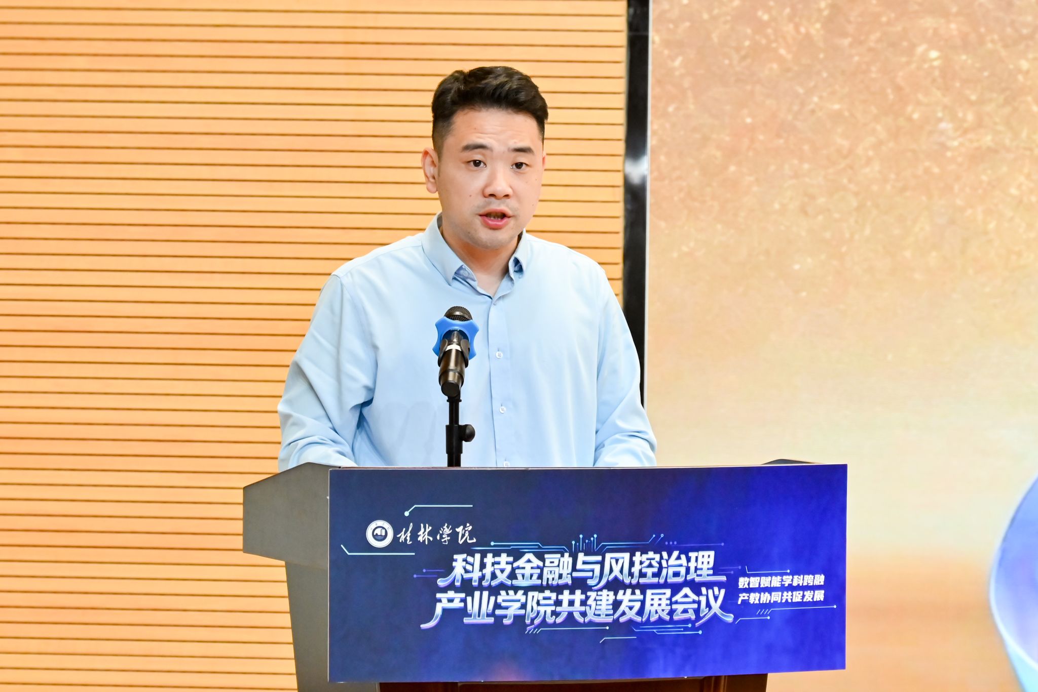 桂林银行桂林分行领导蔡晔作为企业代表发言。他介绍了桂林银行的发展概况与科技金融、风控治理领域的实践成果,表达了深化校企合作的强烈意愿。他表示,桂林银行将依托科技金融与风控治理产业学院平台,积极参与课程共建、实习实训、课题研究等工作,为学生提供真实业务场景与实践岗位,推动校企资源共享、人才共育,实现校企协同发展、合作共赢。