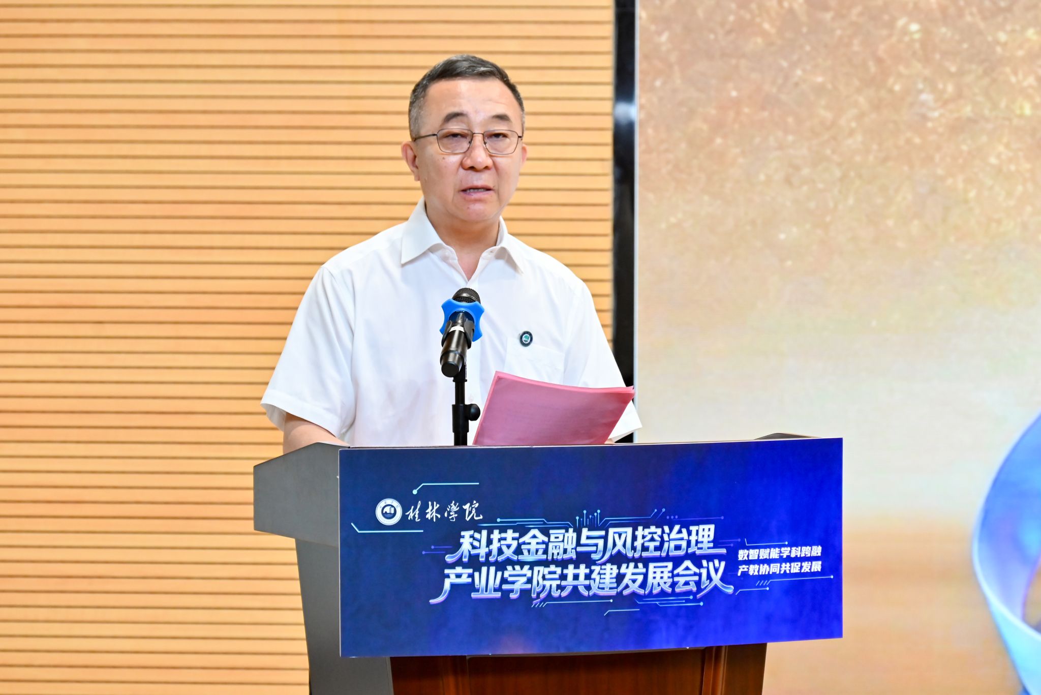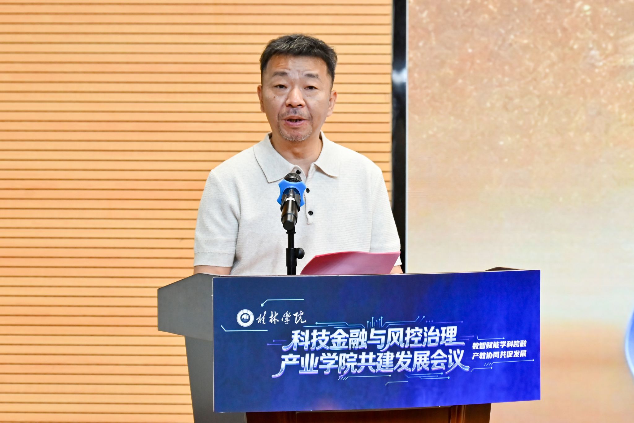 吴郭泉在会上致辞。他指出,当前金融行业数字化、智能化转型加速,成立科技金融与风控治理产业学院,是学校顺应行业发展趋势、深化产教融合、服务地方经济社会发展的重要举措。他表示,学校科技金融与风控治理产业学院将立足应用型人才培养、校协企协同育人、服务地方产业升级三大定位,推动课程体系、实践教学与行业需求深度融合,打造校协企合作创新平台与应用型人才培养示范高地,为广西及桂林金融高质量发展提供人才支撑。