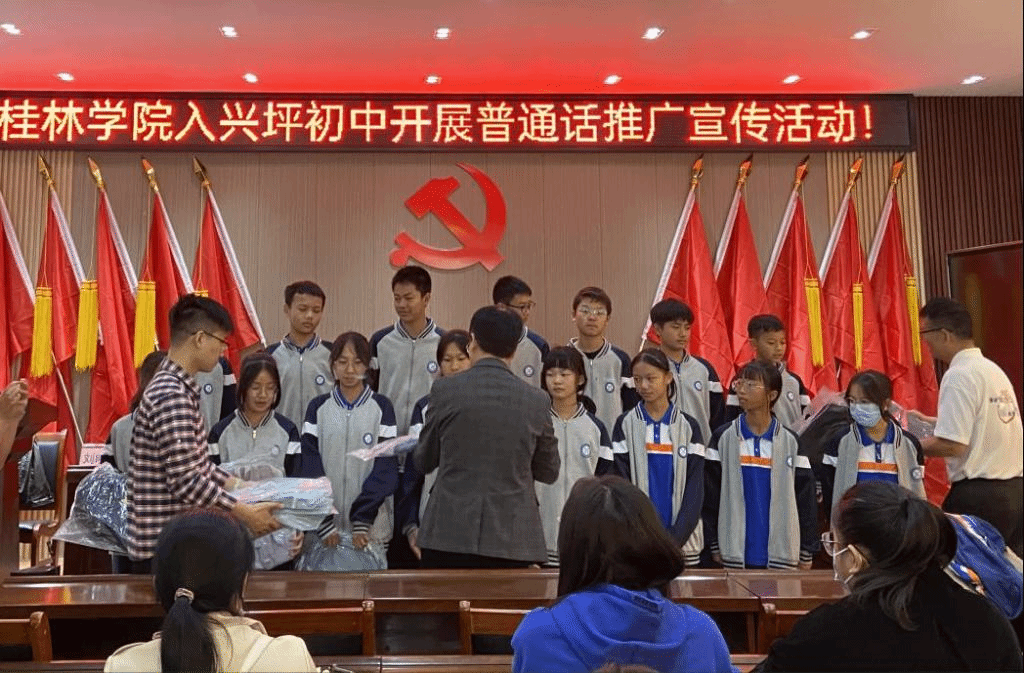 为深入学习宣传贯彻党的二十大精神,同时全面落实习近平总书记关于教育的重要论述和全国语言文字工作会议精神,进一步加强国家通用语言文字的推广普及,服务乡村振兴战略实施。11月14日上午,学校语言文字工作委员会前往阳朔县兴坪镇初级中学开展“乡村振兴对口支援”推普活动。