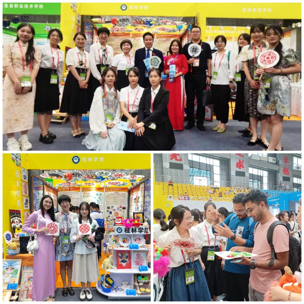 我校学前教育专业是广西民办高校优势特色专业和学校一流专业,学前教育专业结合办学定位及专业特色,依托自治区级课程思政示范课程《幼儿园手工制作》,精心策划筹备了“培根铸魂育新人,启智润心担使命”为主题的专业教育展示。展出了以传统手工艺、自制教玩具为主的学前教育专业美术类课程以及多门专业课程联合教学的实践作品,充分展示了学前教育专业技术技能服务和应用于幼儿教育、现代生活的成果。期间,联合国教科文组织曼谷多部门地区办事处代理主任汪利兵、自治区教育厅厅长刘友谊等领导嘉宾,来自印尼、马来西亚、新加坡、菲律宾、泰国等东盟国家高校的嘉宾,以及广西各兄弟院校领导来到设在广西建设职业技术学院体育馆的桂林学院技术技能服务现代生活展位观展和指导。精美的剪纸、刻纸、衍纸、竹编、脸谱、醒狮等极具中华优秀传统文化及民族文化特色的作品吸引了诸多外宾驻足欣赏和参与体验。杨树喆、杨庆庆,看望参加联展活动的全体师生,并观看了我校舞蹈学专业师生创作的《漓江春早》舞台展演。