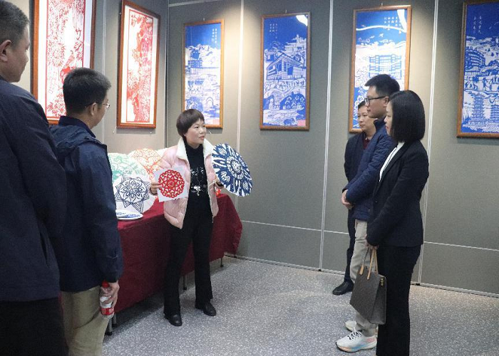 图:黄红韩老师为协同育人单位介绍剪纸作品