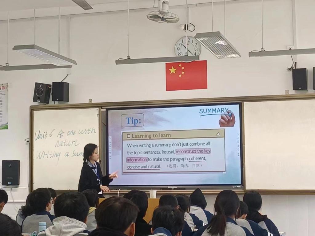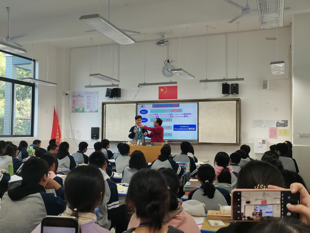 现场授课分别由宏谋中学教研组长阳文山和学校2020级实习生陆艾已完成。阳文山利用视频导入新课,充分激发学生的学习兴趣。课堂内容设计精妙,层次分明地完成了阅读部分的教学任务,自然地过渡到写作部分的讲解,其内容简洁、明了、易懂,让学生高度参与课堂。最后,让学生实际体验泡茶的步骤,增进对茶道文化的理解,提升学生的文化意识。陆艾已通过学生熟悉的语篇自然引入主题,带领学生归纳总结概要写作的要点,鼓励学生独立思考,提高学生解决问题的能力,体现学生的主体与教师的主导作用。