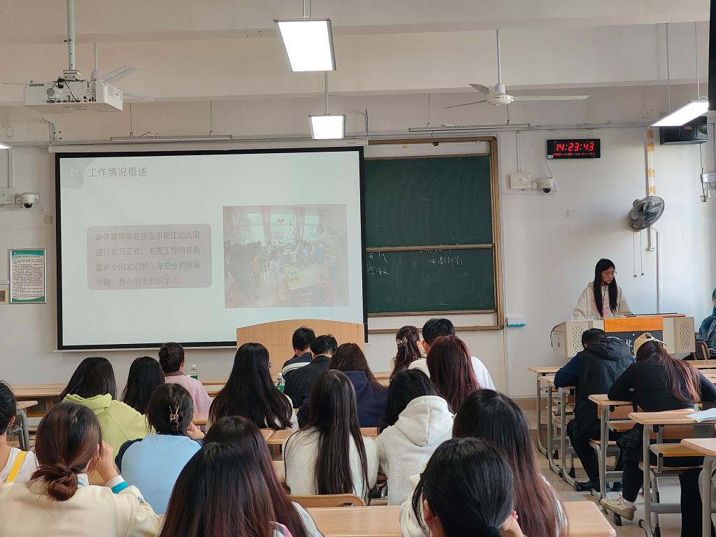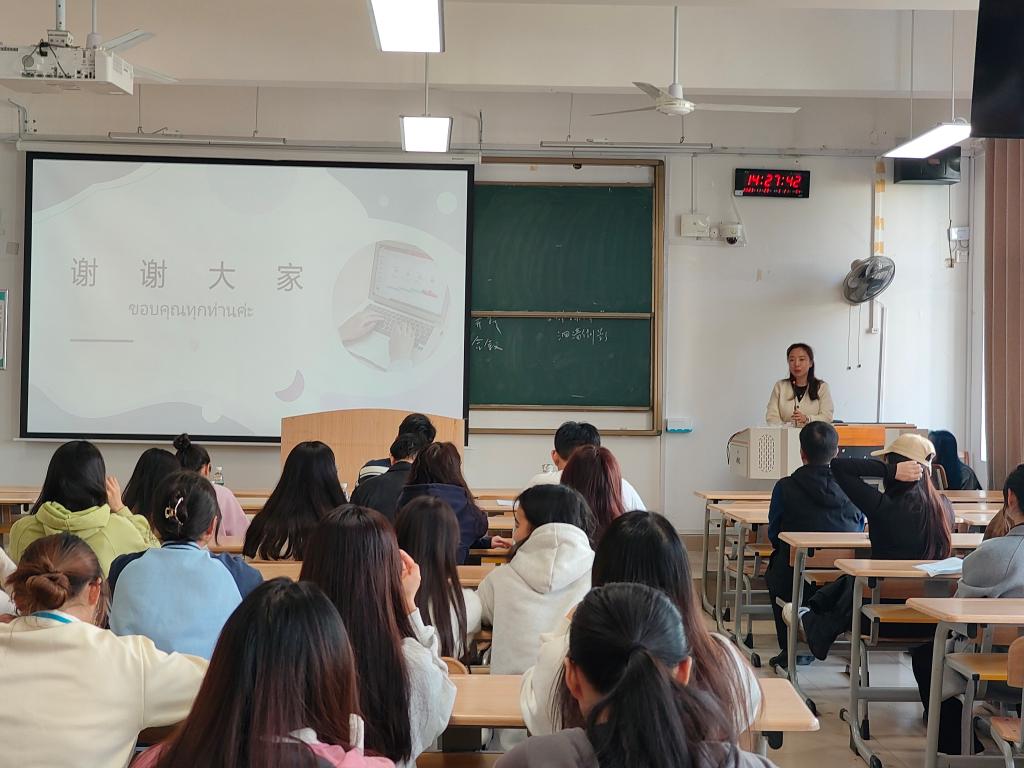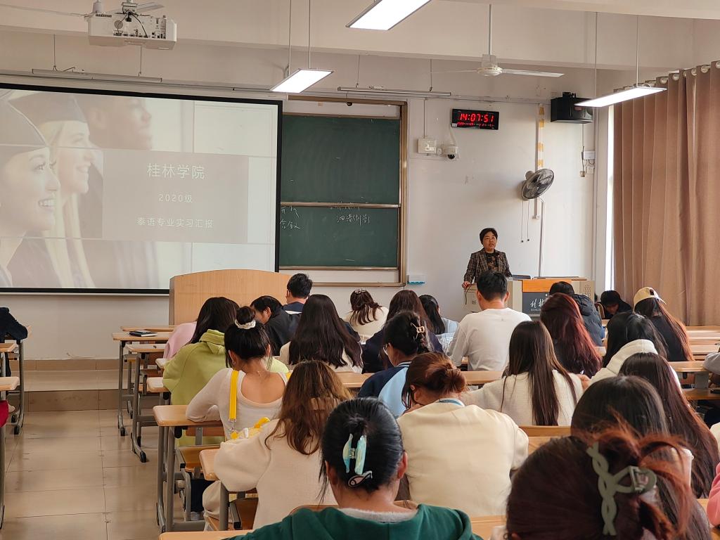 11月29日下午,人文学院2020级泰语专业在1309教室举行实习总结汇报大会。副校长、人文学院院长何玲出席大会并讲话。人文学院全体领导班子,泰语专业全体教师,2020级、2022级、2023级泰语专业全体学生参加大会。 会议伊始,何玲发表致辞。她对2020级泰语学生在实习中取得的成绩及学院实习工作领导小组的努力给予充分肯定。何玲表示,专业实习工作非常重要,她希望同学们要成为对国家和社会有用的人才,并对他们的未来充满期待。